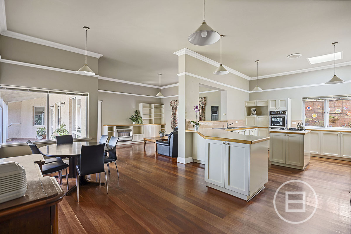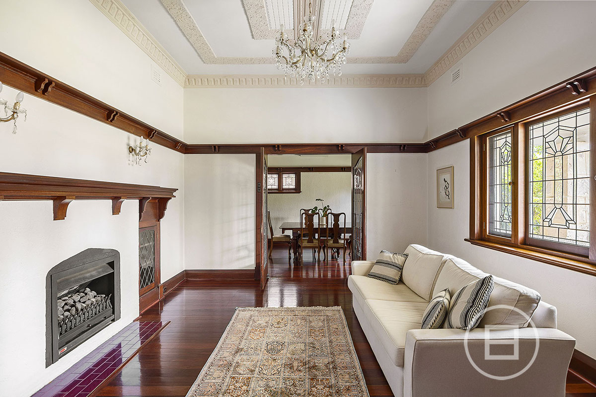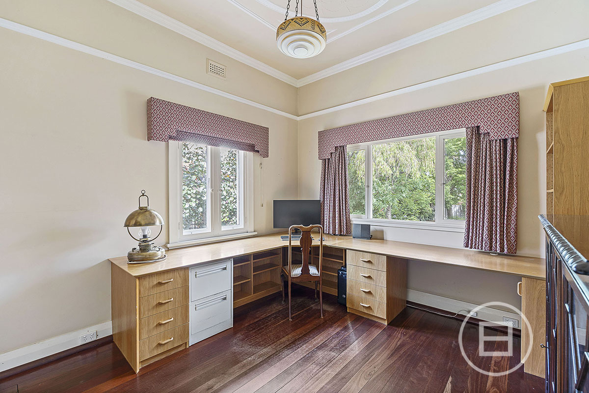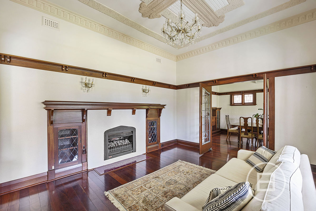 Step inside to discover soaring decorative ceilings adorned with ornate plasterwork and sparkling chandeliers. Rich timber wall panelling and Jarrah floorboards create a warm, inviting atmosphere, enhanced by a feature fireplace and elegant vintage fittings. Formal entertaining areas flow into a dedicated home office/study complete with bespoke cabinetry and garden outlooks.