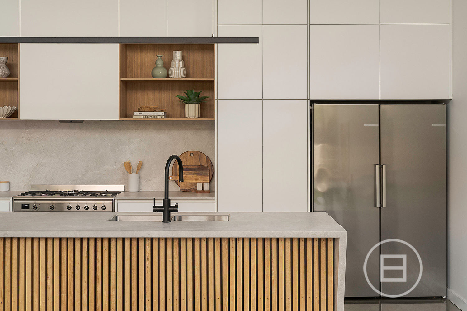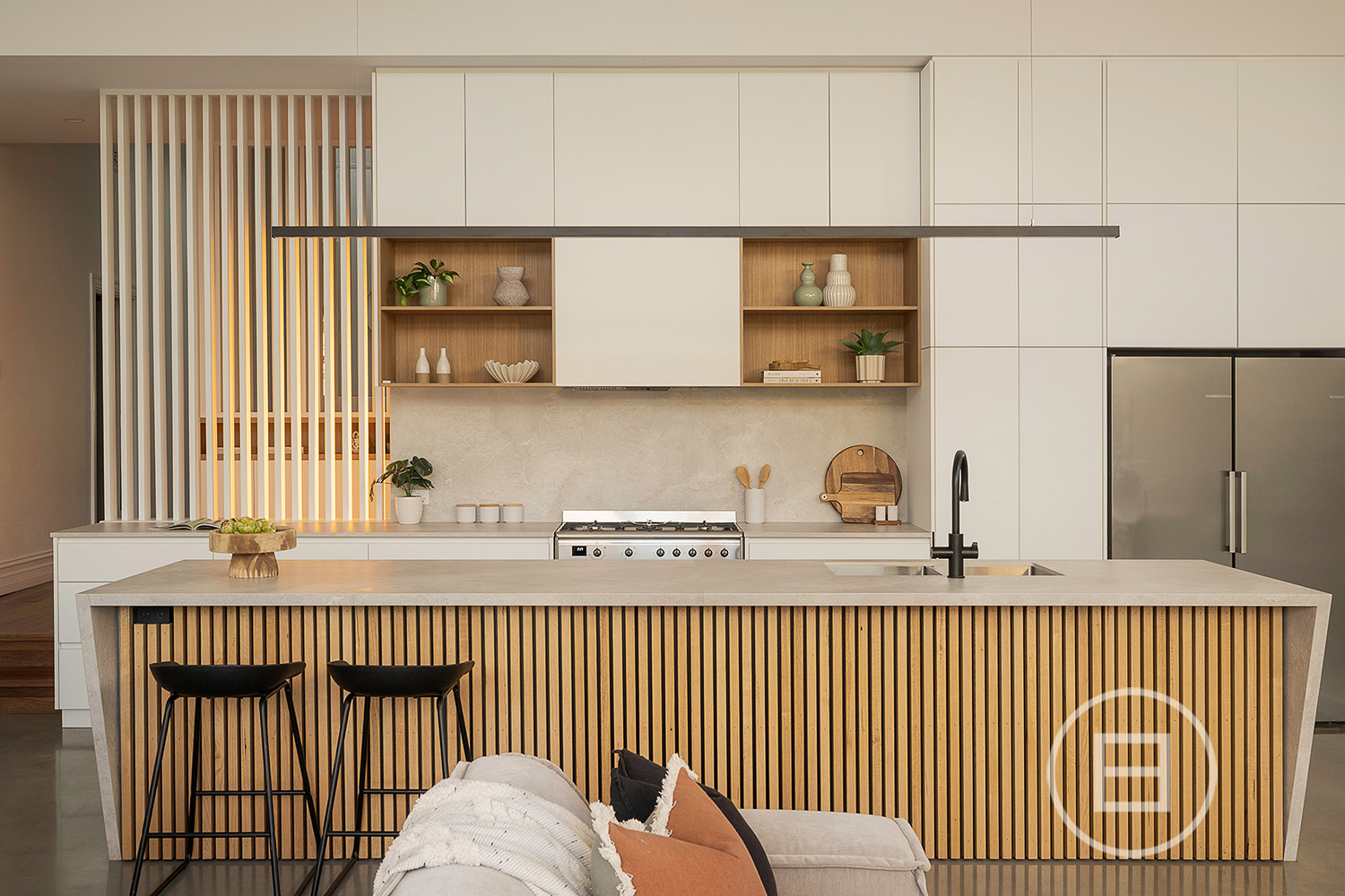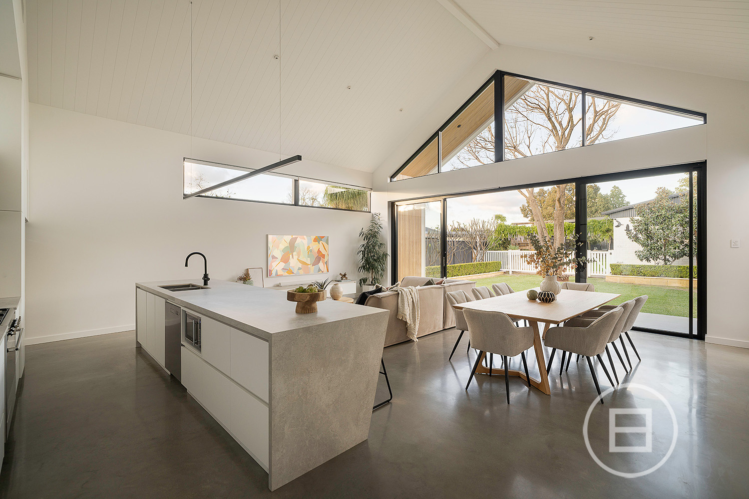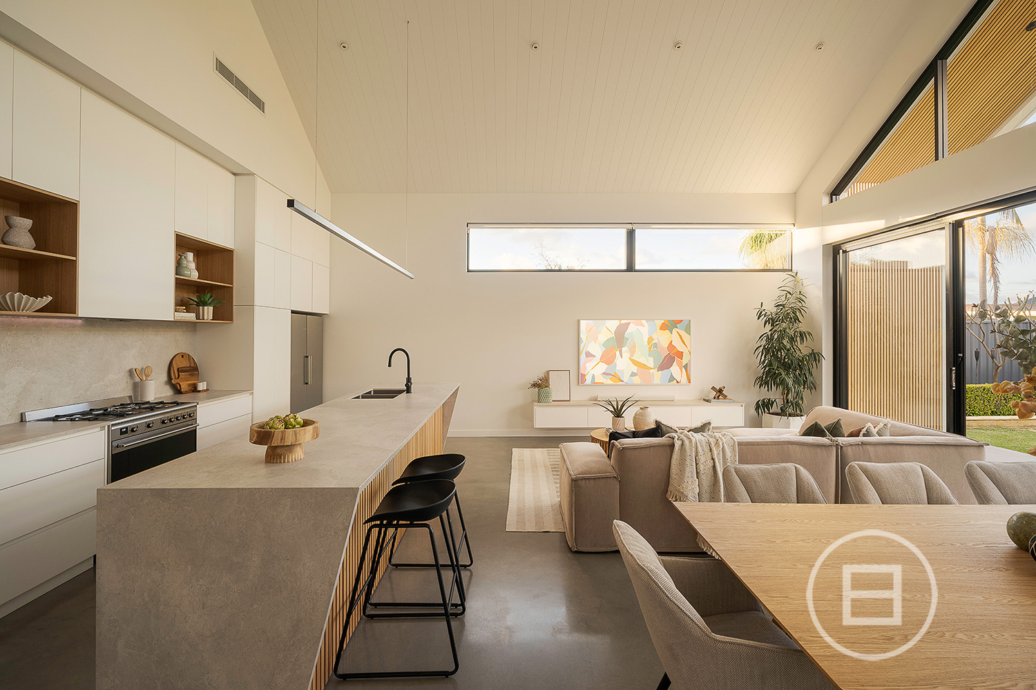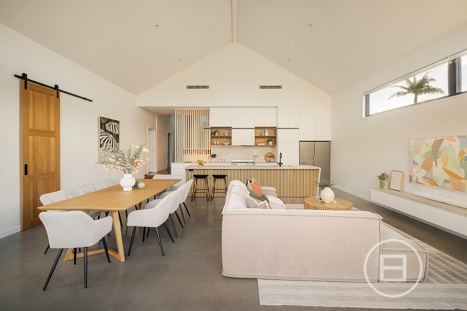 Returning inside, the home is enhanced by contemporary luxuries including polished concrete floors with underfloor heating, ducted smart air conditioning, electric blinds, intelligent lighting and wiring, and a high-spec G4 Zip tap delivering sparkling, boiling and chilled water.