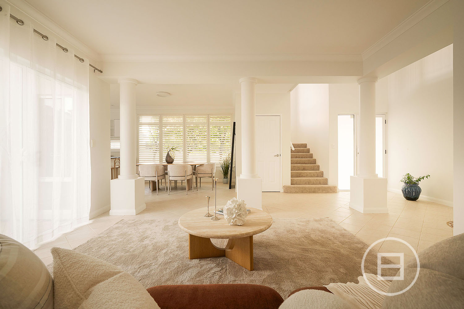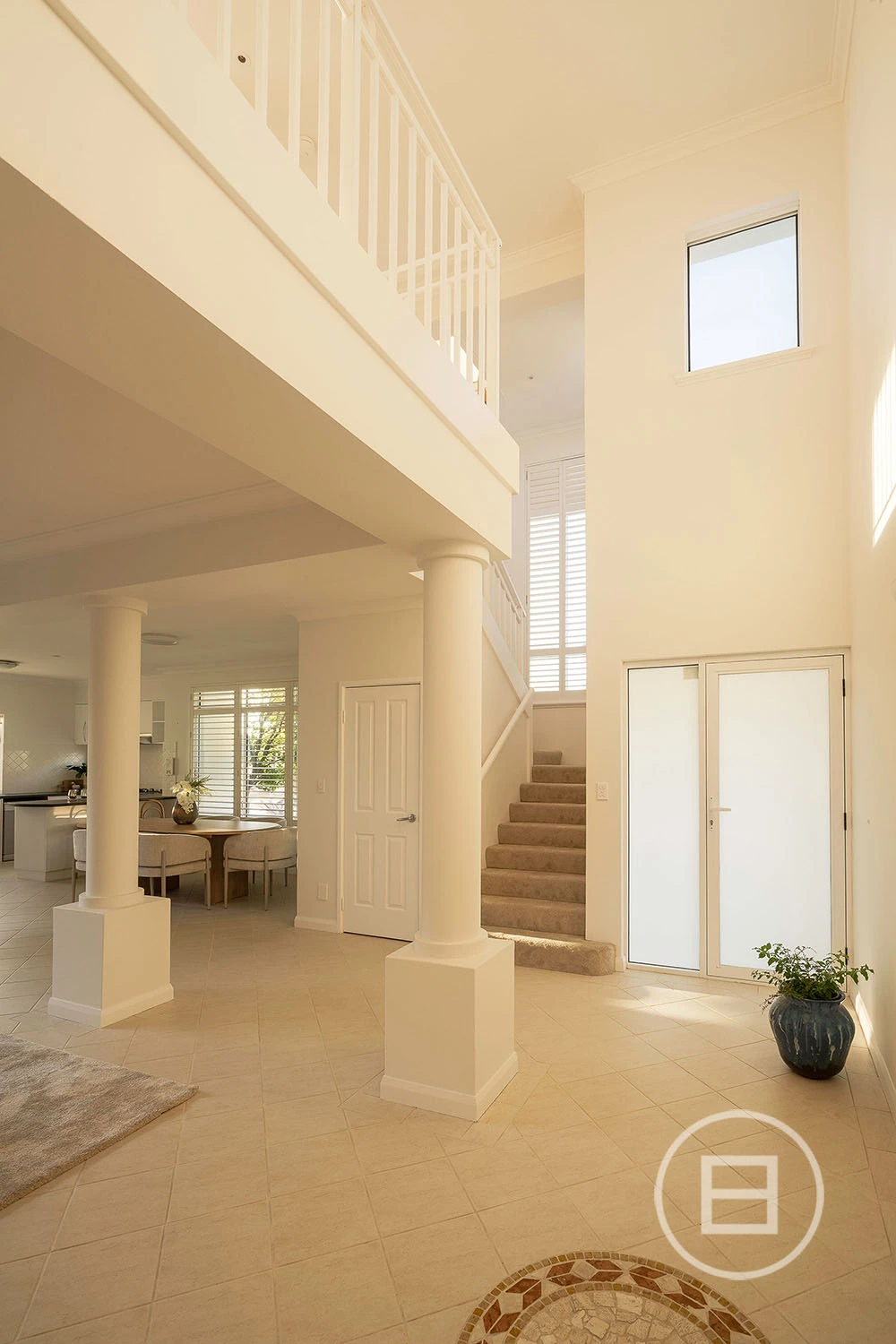 A clean white façade with strong architectural lines creates a confident street presence, framed by established landscaping that provides privacy and a welcoming approach. Inside, the entry opens to a double-height foyer filled with natural light, immediately highlighting the scale of the home and its practical design. Neutral finishes and tiled flooring through the main living areas give the interiors a timeless, easy-to-maintain feel.