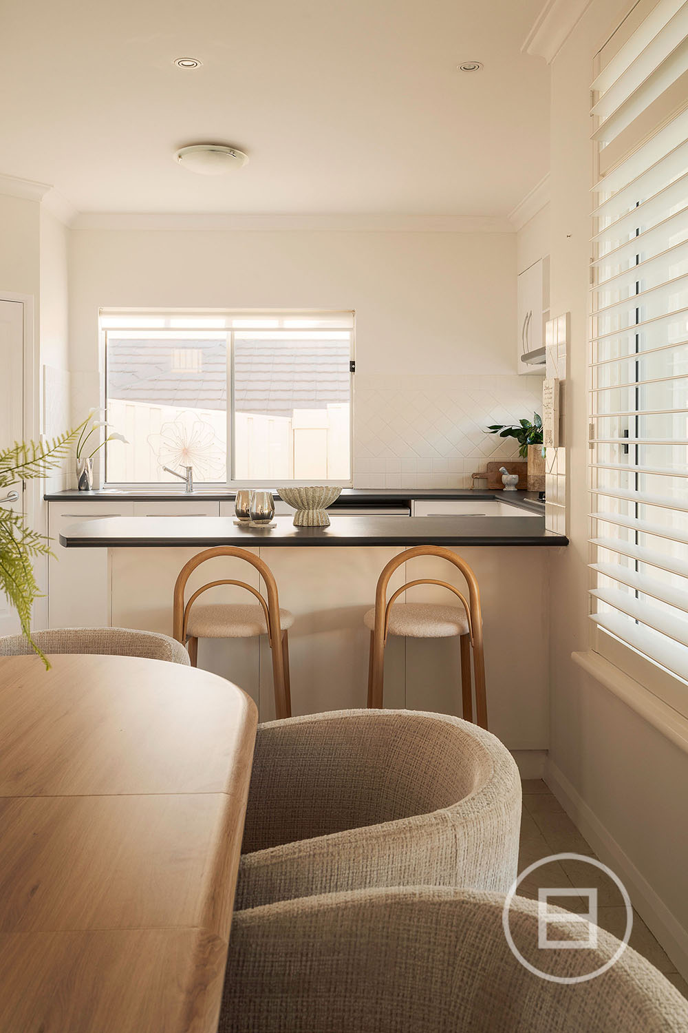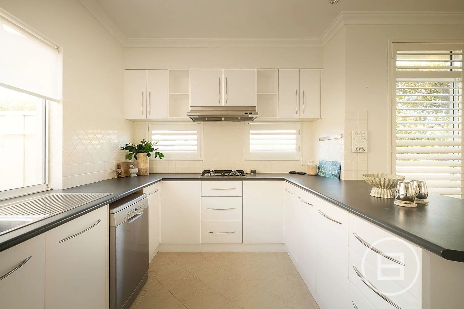The ground floor centres around a generous open-plan kitchen, living and dining area designed for both daily living and entertaining. Large windows and sliding doors invite in natural light and coastal airflow, while plantation shutters provide privacy and climate control. The kitchen is functional and well laid out, featuring a breakfast bar, ample storage, and strong connection to indoor and outdoor dining spaces.