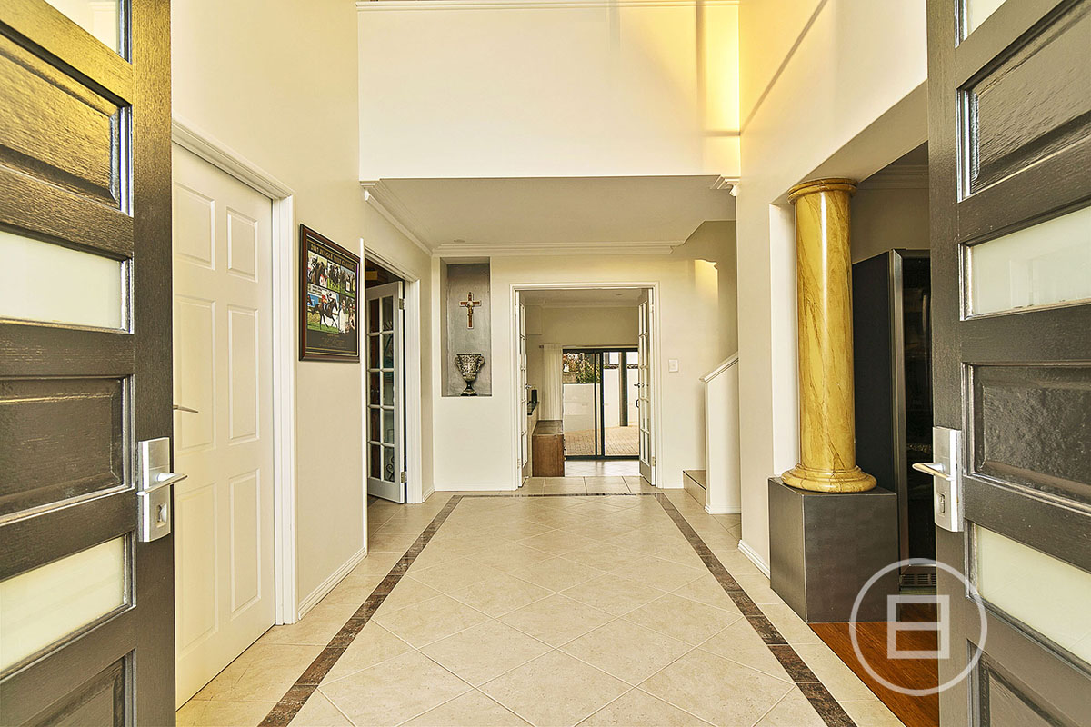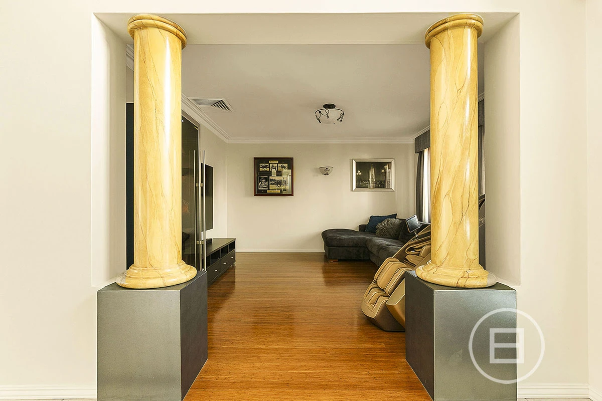 Striking from the first glance, the home’s modern profile is accentuated by a rendered brick exterior, arched windows, tall feature columns, and sculpted hedging—offering a statement of refinement without sacrificing warmth. Beyond the manicured frontage and paved driveway, an elegant entryway sets the scene with its sweeping architecture and soaring ceilings.