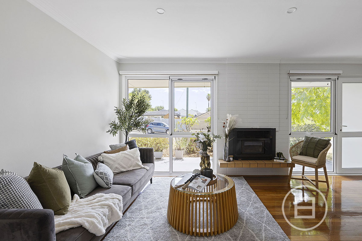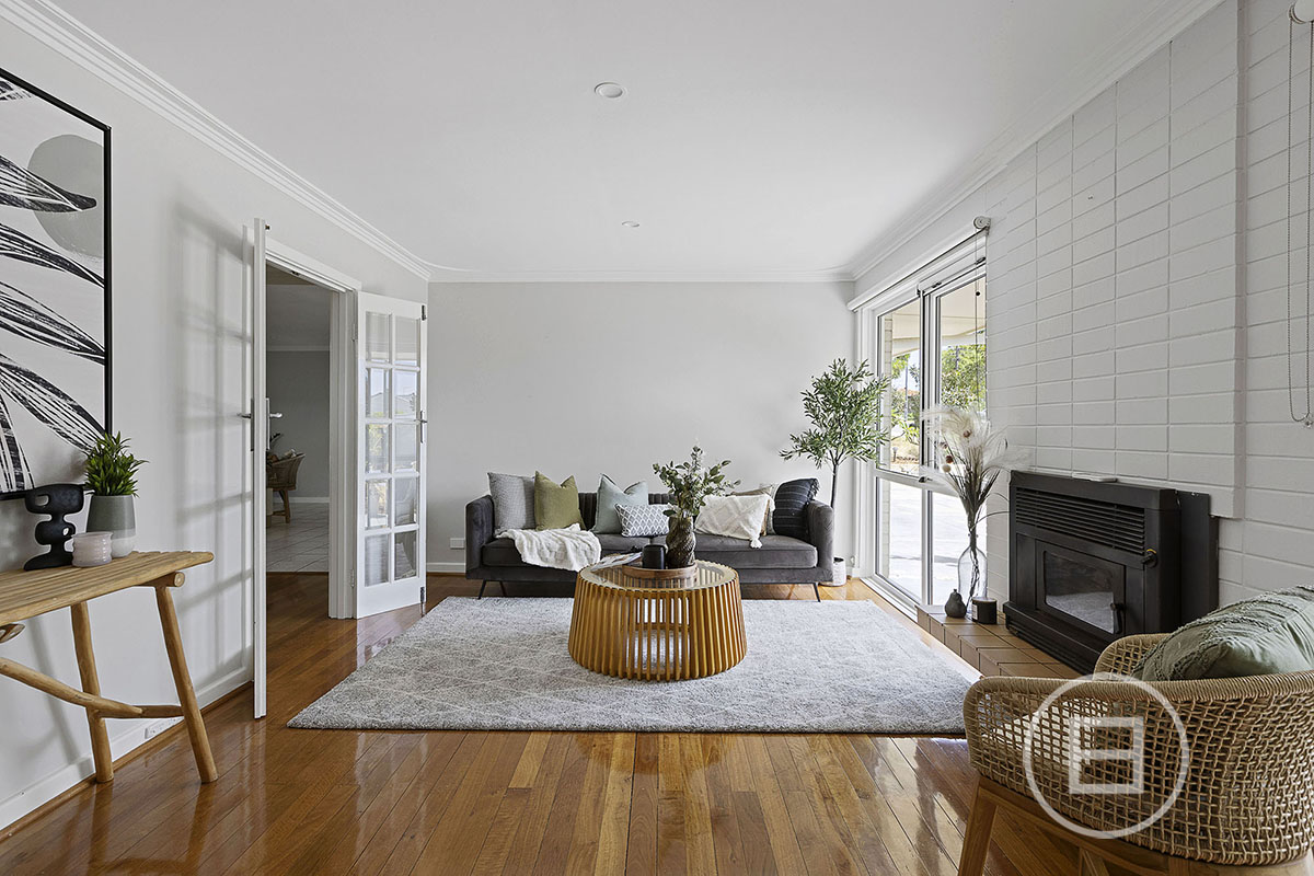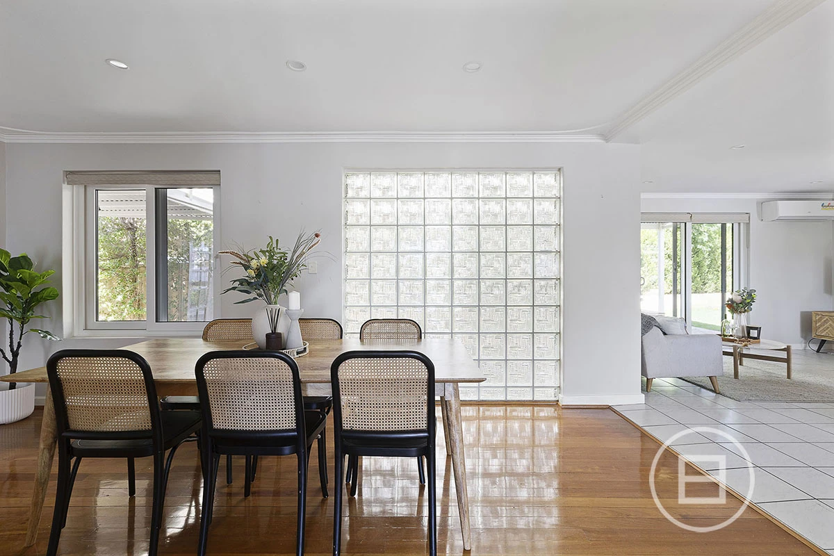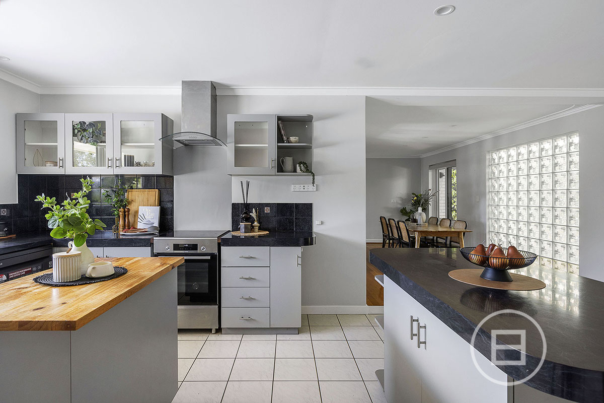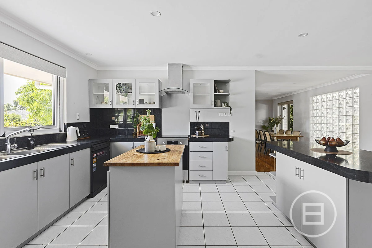 Natural light fills rooms from multiple angles, opening to a large-scale lounge room that centres on a wood-burning fireplace, and a separate open-plan living area with character filled dining and an enormous kitchen with dual islands and stainless-steel appliances. Entertaining is a literal breeze outdoors under the double-gabled pergola and open sunny gardens, with a mango tree, shed and plenty of space to kick back and relax in any season. The layout works well for growing needs, with four sizeable bedrooms and two bathrooms, including an en-suite to the main bedroom with a walk-in robe, and a renovated central bathroom with a deep bath and skylight above.