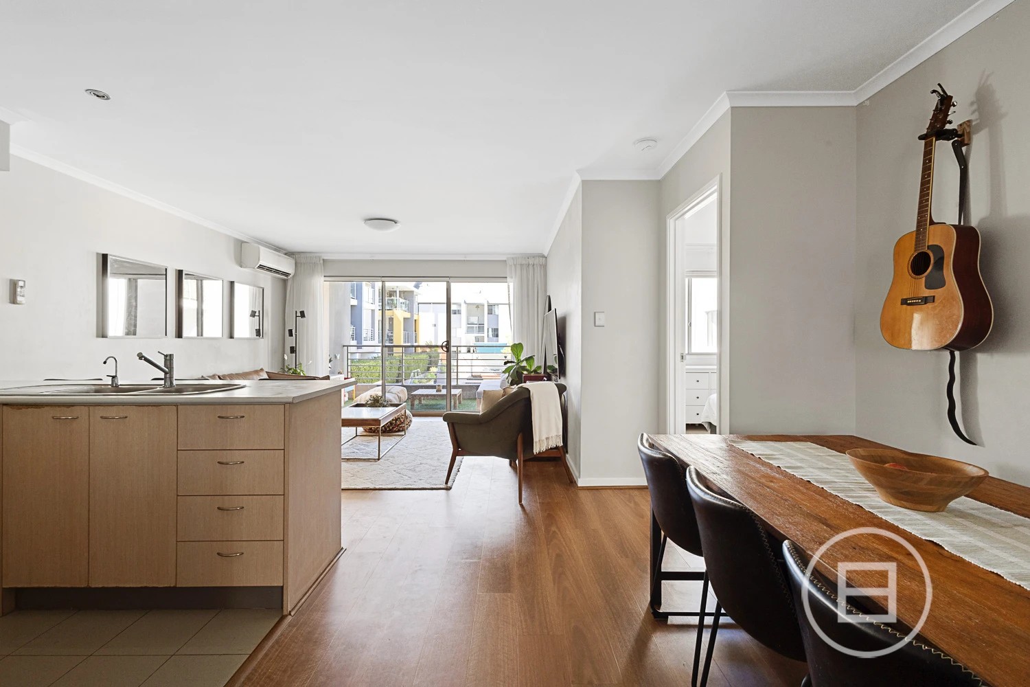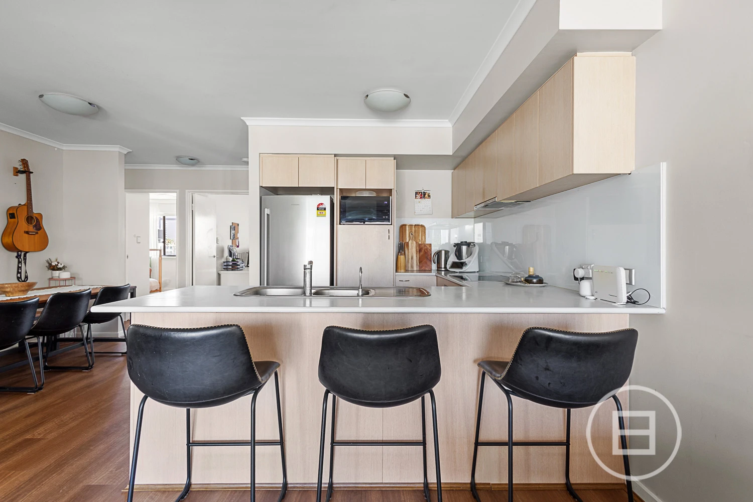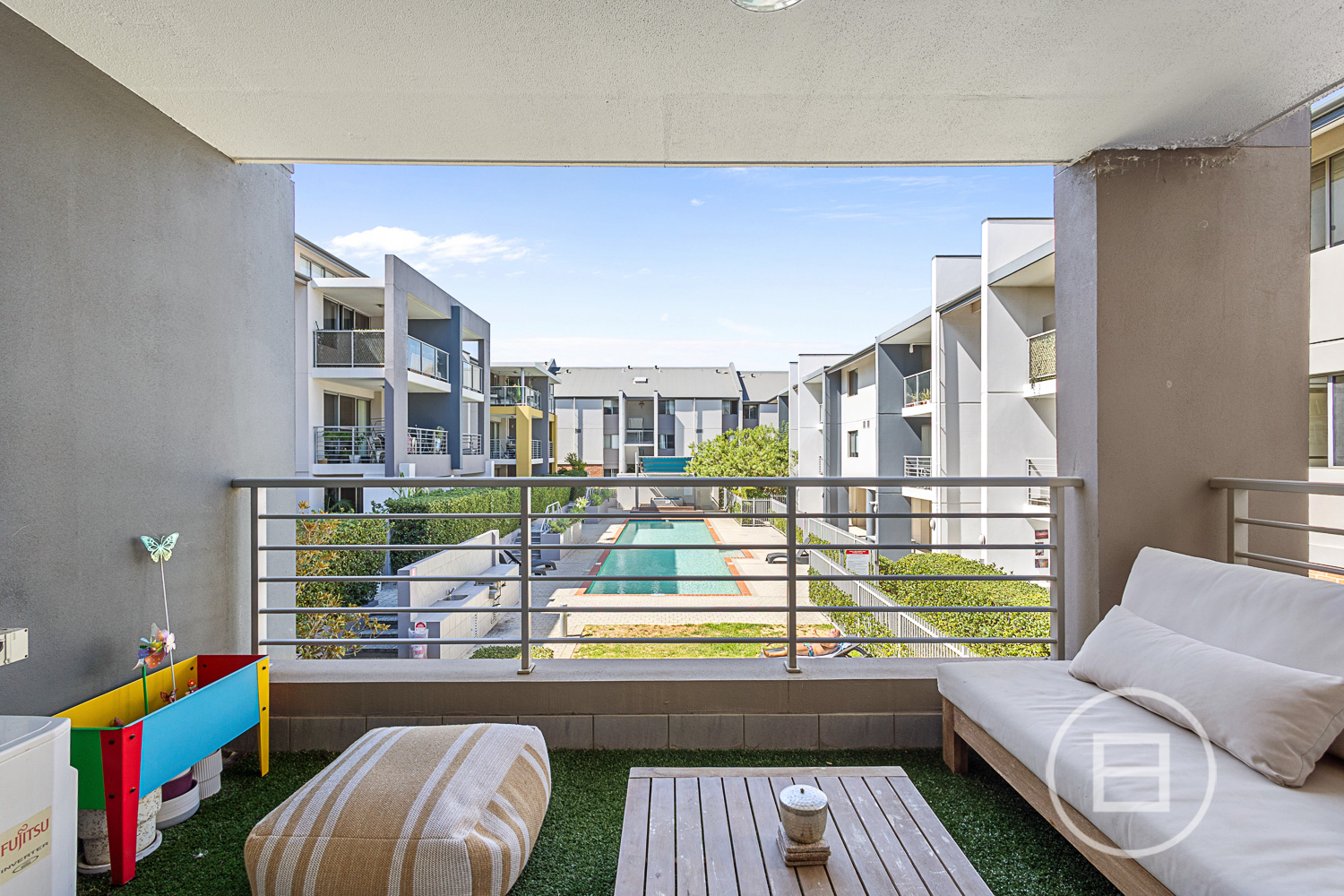 A modern kitchen with plenty of storage, breakfast bar, and quality appliances is the heart of the open-plan dining and living area. Timber-look flooring enhances the seamless flow between zones, while sliding glass doors reveal the private covered balcony—artificial turf underfoot and secure metal balustrades—framing tranquil pool views and urban vistas.
