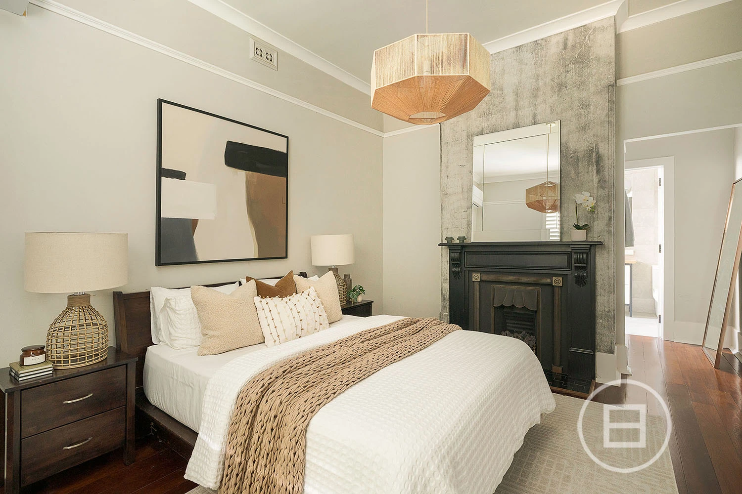 The inviting street-facing verandah and established garden path draw you to a meticulously designed interior where heritage details meet modern craftsmanship. Wide hallways with architectural lighting stretch from the character-filled front rooms to the spacious central living hub. The master suite offers a private retreat, complete with a fireplace, custom walk-in robe, and a sleek ensuite boasting a walk-in rainfall shower and double vanity surrounded by floor-to-ceiling tiling and industrial-inspired accents.