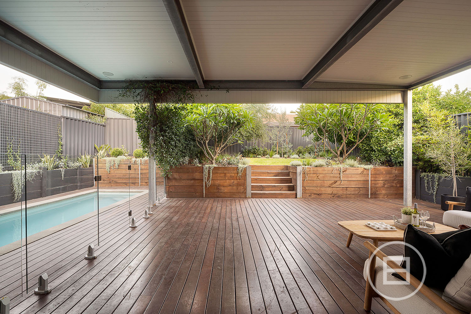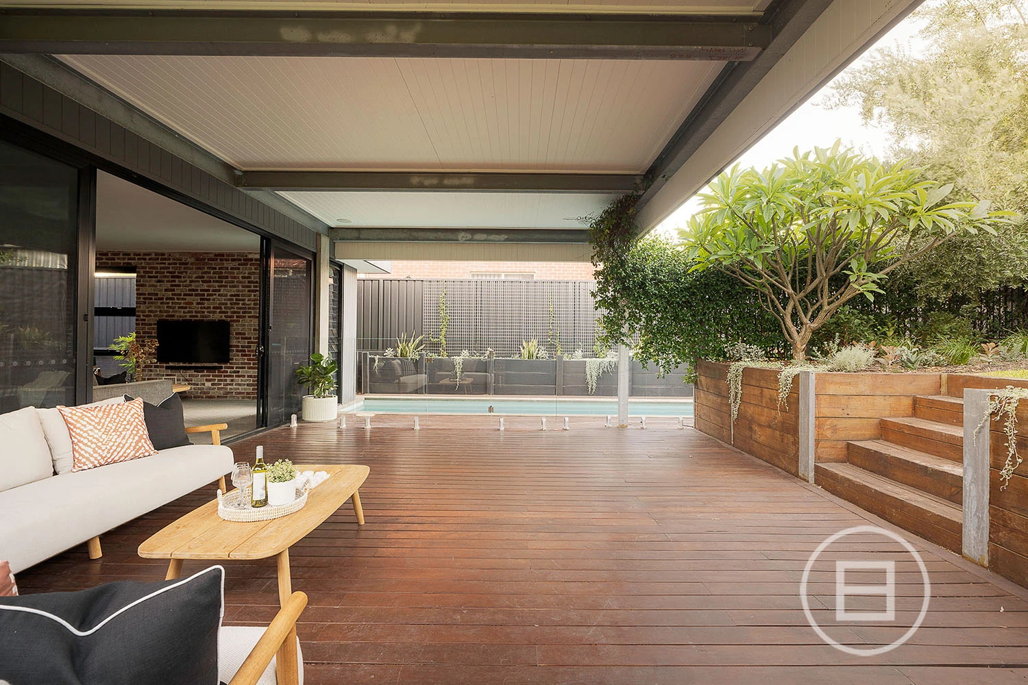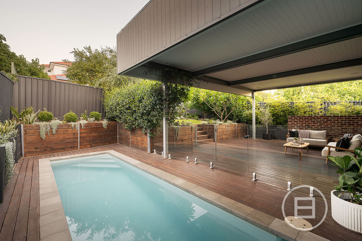 The expansive alfresco deck, finished in local Jarrah, is fully equipped for future upgrades and year-round entertaining, overlooking a sparkling glass-fenced pool and lush landscaping. Practical features include a large laundry with custom cabinetry, a private drying court, outdoor shower and securely fenced front and back yards.