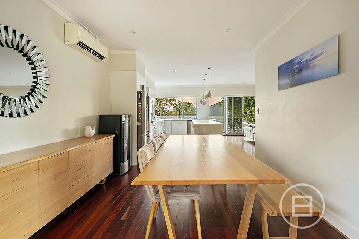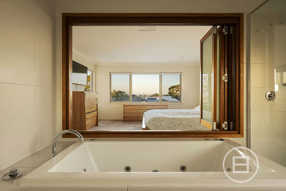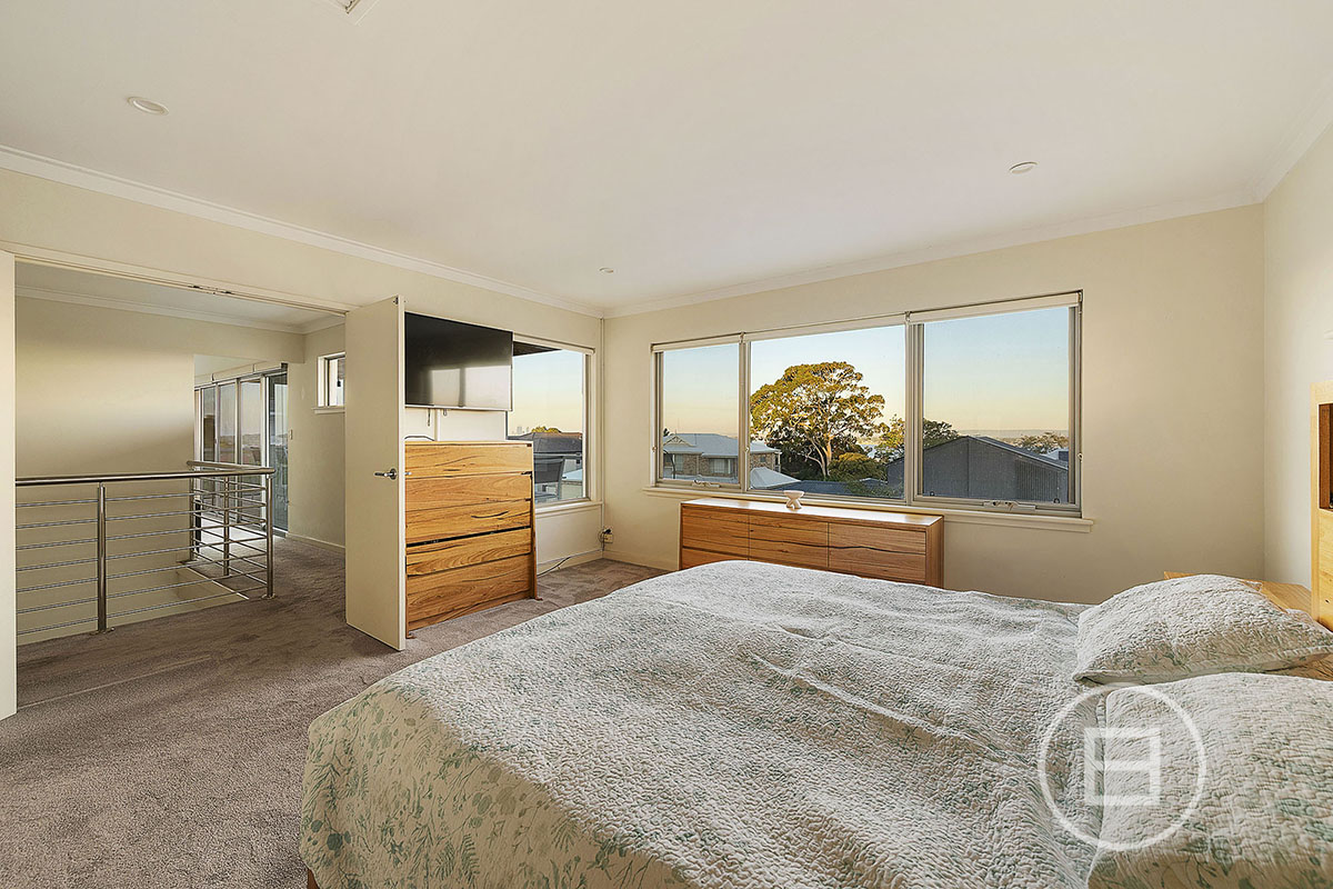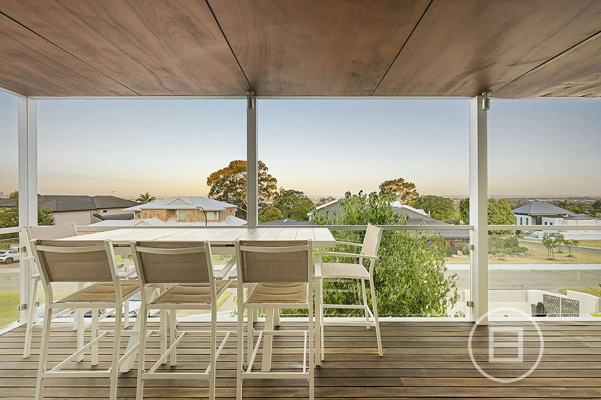 The upper level is dedicated entirely to the parents’ retreat, making the most of the home’s elevated position and sweeping 180-degree river and city views. The spacious bedroom is accompanied by dual walk-in robes, a generous ensuite with spa bath, a private lounge opening to a large timber deck, and a separate study with additional powder room.