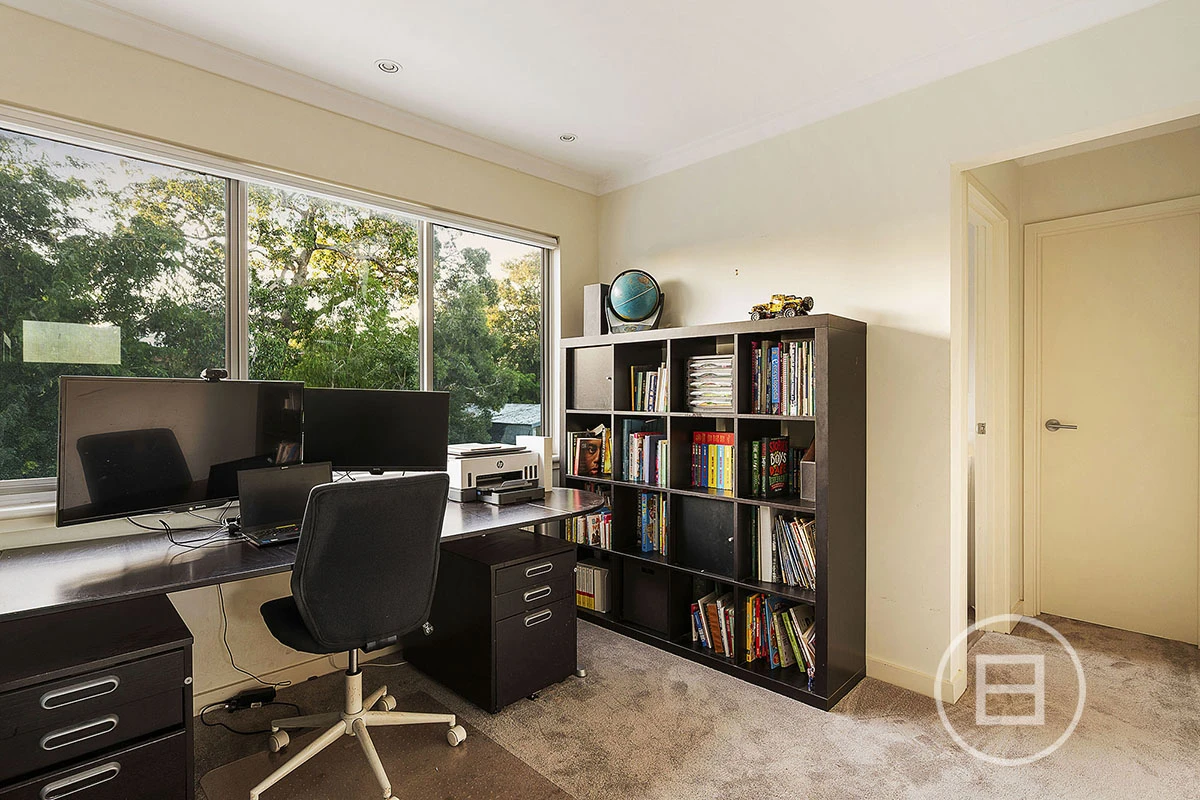 Three bedrooms are located on this level, including a versatile guest or teenager’s suite with ensuite and walk-in robe, along with two additional bedrooms featuring built-in robes, desks and garden outlooks. A well-appointed family bathroom completes the floor.