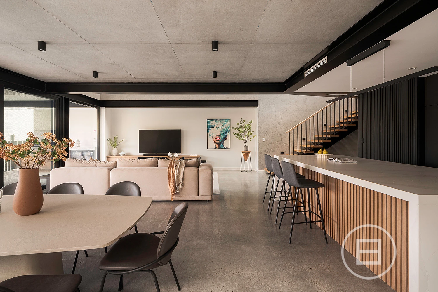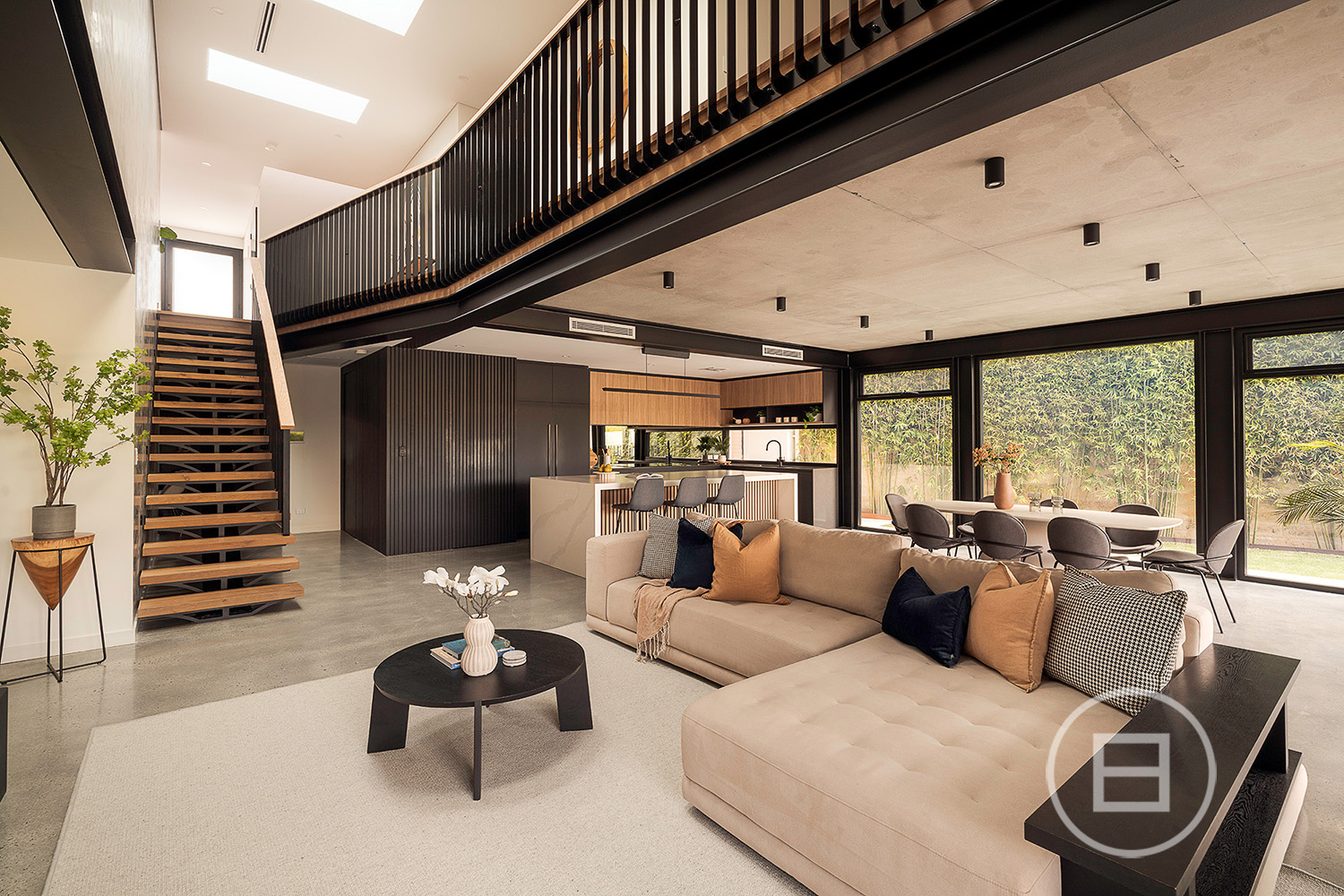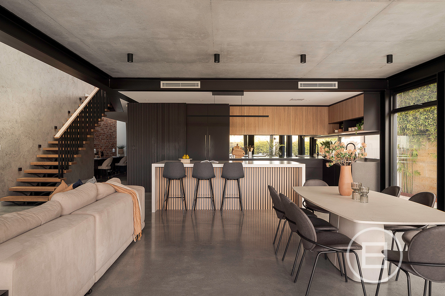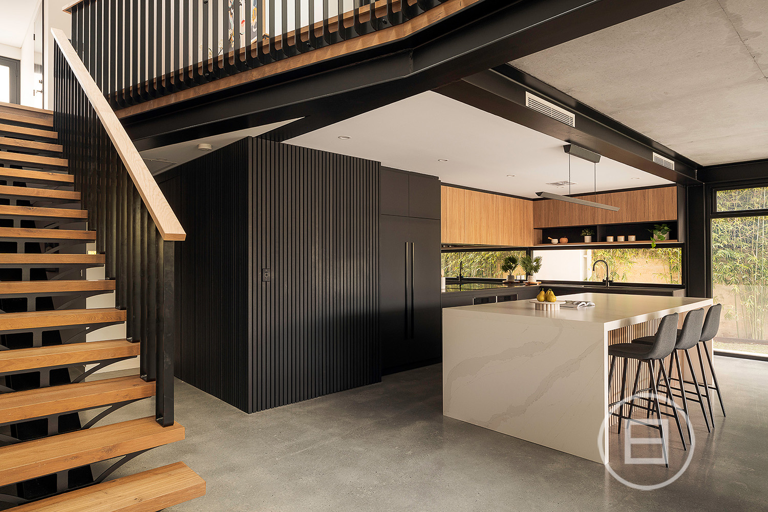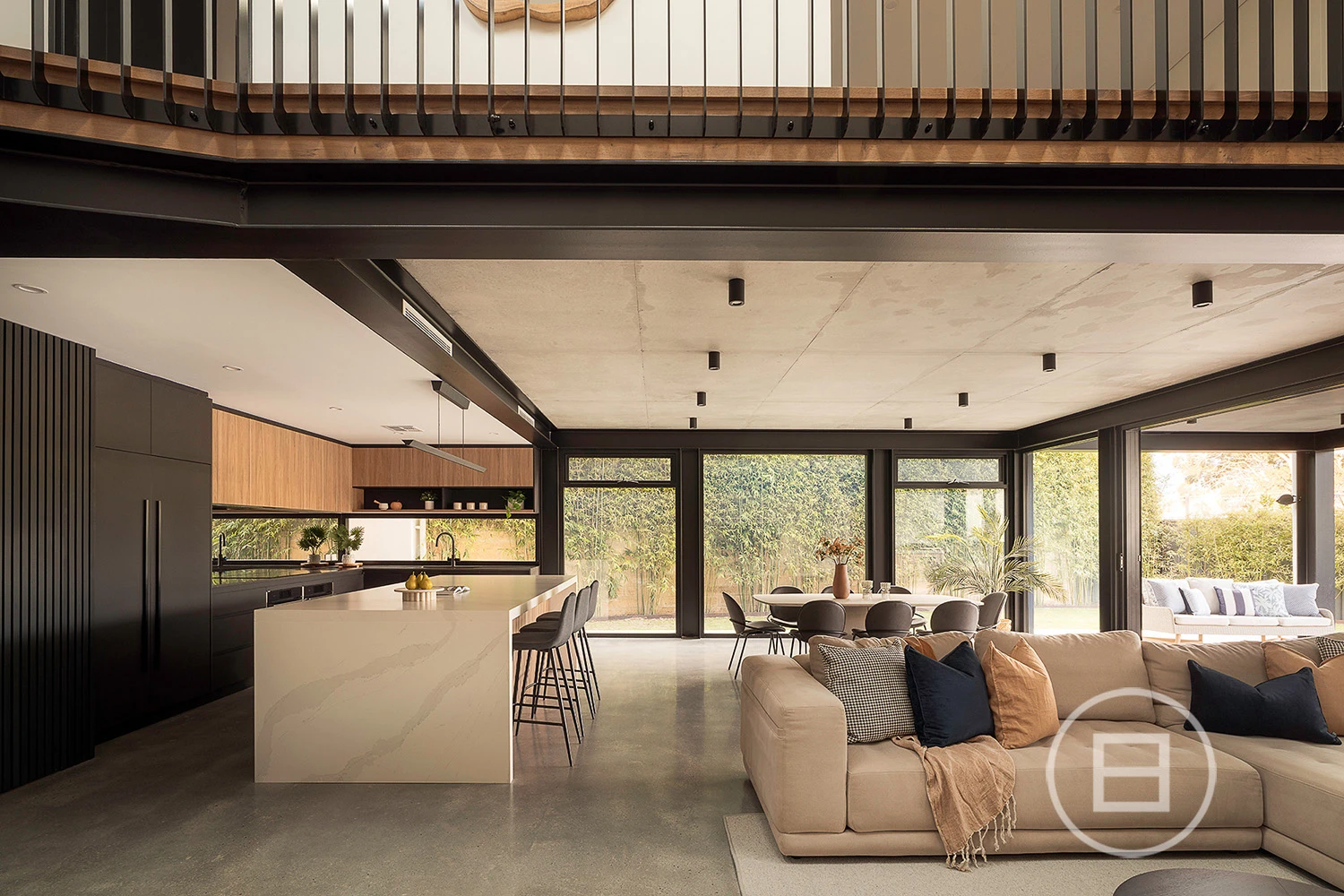 Multiple living areas are placed exactly where a growing household needs them, with glass rising through each level, drawing natural light across the sky-lit recycled red brick spine and the mezzanine void above the main lounge. Polished concrete floors and raw ceilings bring a robust aesthetic to the open-plan area, warmed by oak veneer, crisp white stone surfaces, and garden greenery that draws the eye through wall-to-wall north and east-facing glass. Premium all-electric appliances, ZIP tap with hot, cold and sparkling water and extensive storage create a highly capable kitchen for those who love to cook and host, complemented by an integrated outdoor BBQ that extends the interior to generous poolside entertaining whenever the mood strikes.