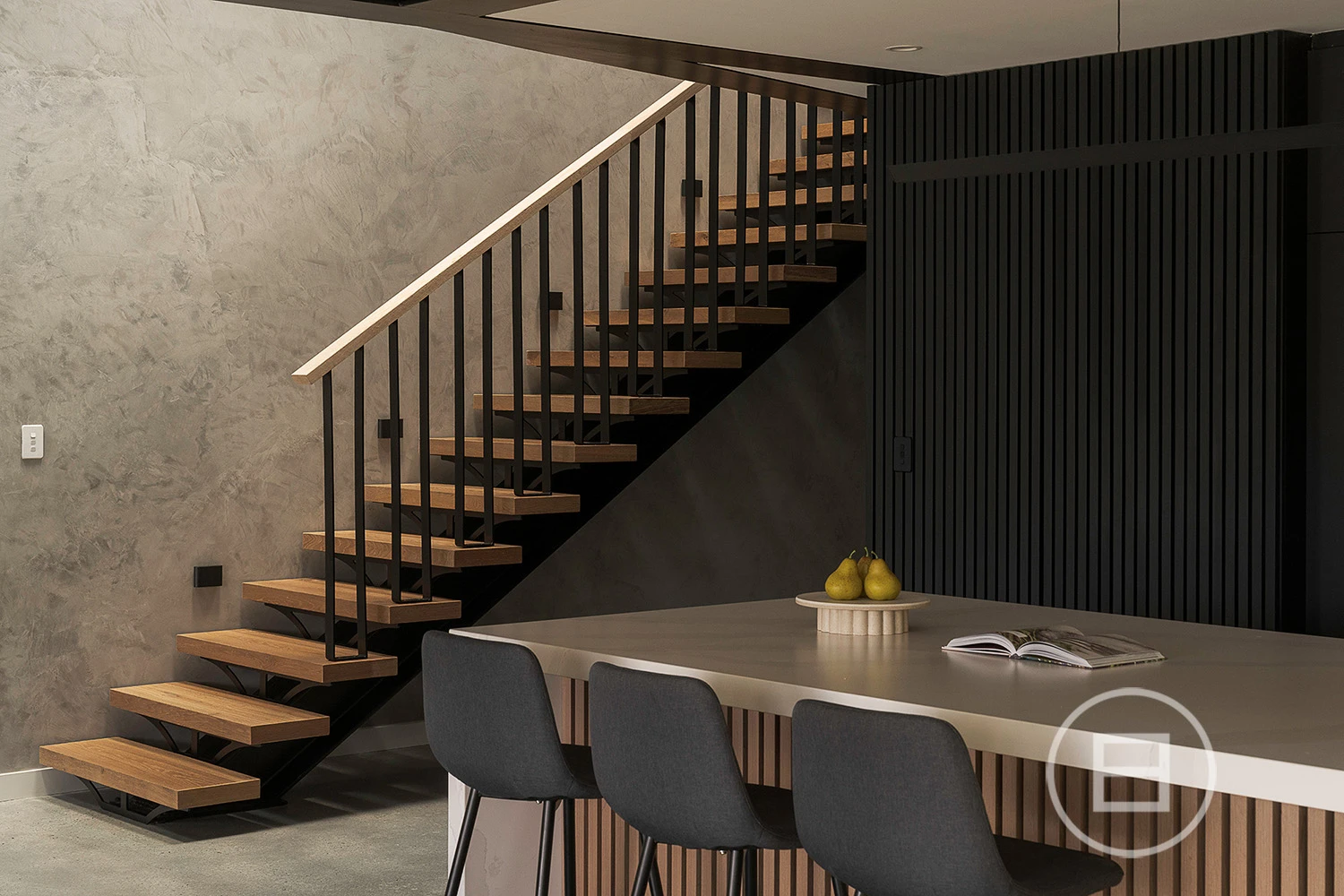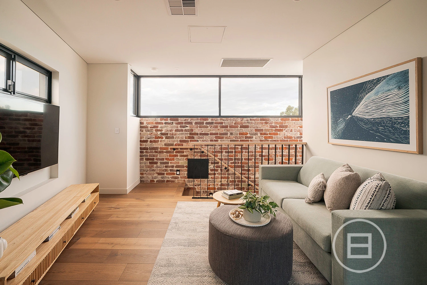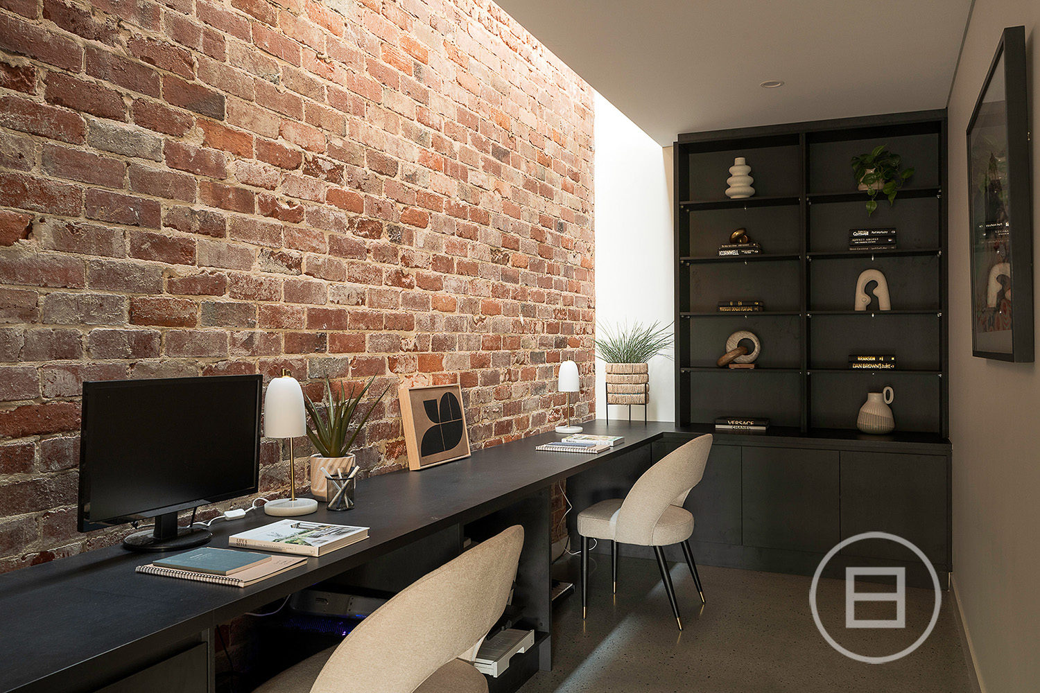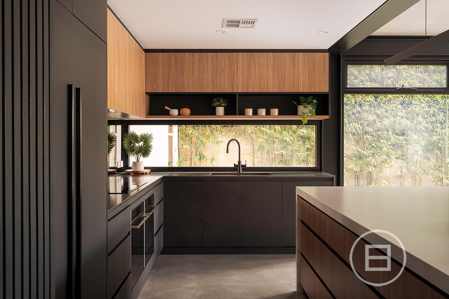 Multiple living areas are placed exactly where a growing household needs them, with glass rising through each level, drawing natural light across the sky-lit recycled red brick spine and the mezzanine void above the main lounge. Polished concrete floors and raw ceilings bring a robust aesthetic to the open-plan area, warmed by oak veneer, crisp white stone surfaces, and garden greenery that draws the eye through wall-to-wall north and east-facing glass. Premium all-electric appliances, ZIP tap with hot, cold and sparkling water and extensive storage create a highly capable kitchen for those who love to cook and host, complemented by an integrated outdoor BBQ that extends the interior to generous poolside entertaining whenever the mood strikes.
