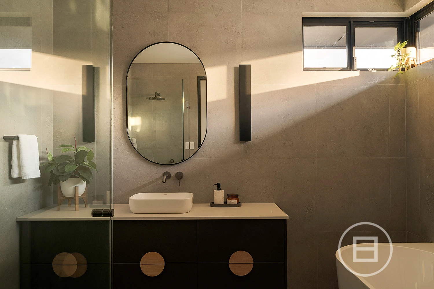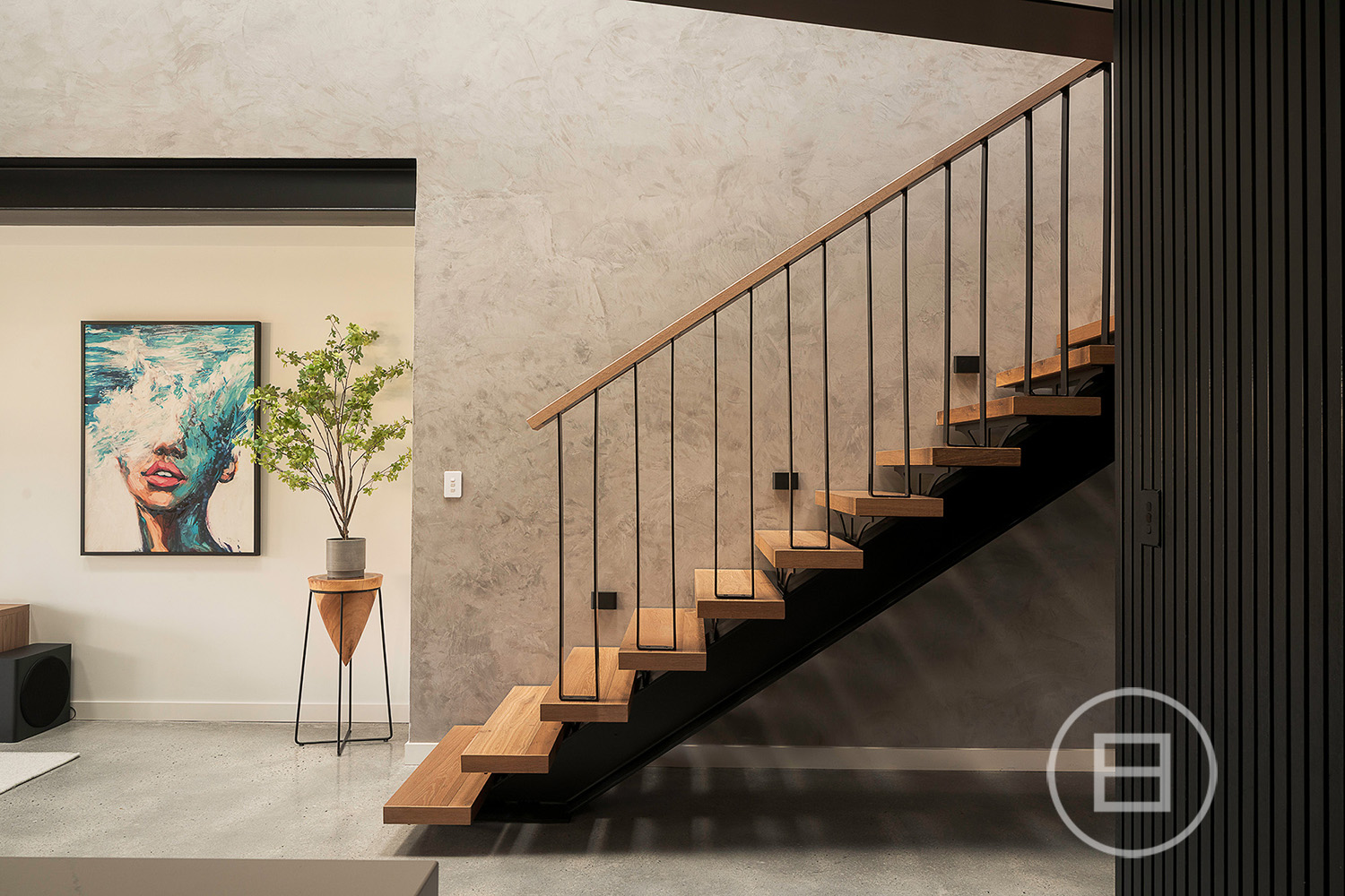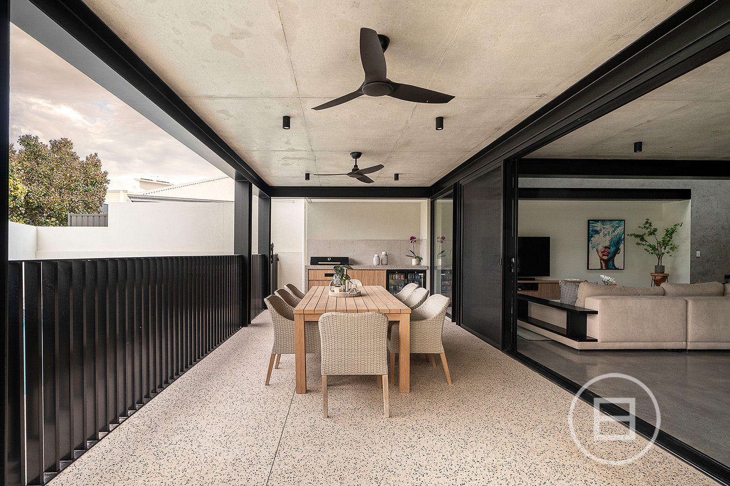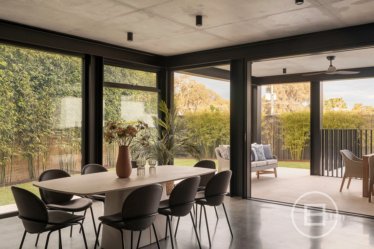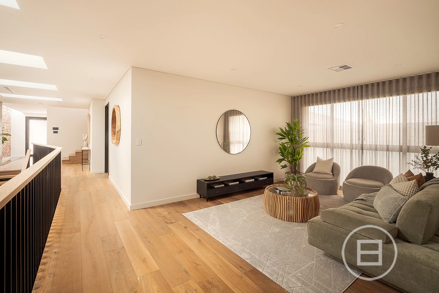Multiple living areas are placed exactly where a growing household needs them, with glass rising through each level, drawing natural light across the sky-lit recycled red brick spine and the mezzanine void above the main lounge. Polished concrete floors and raw ceilings bring a robust aesthetic to the open-plan area, warmed by oak veneer, crisp white stone surfaces, and garden greenery that draws the eye through wall-to-wall north and east-facing glass. Premium all-electric appliances, ZIP tap with hot, cold and sparkling water and extensive storage create a highly capable kitchen for those who love to cook and host, complemented by an integrated outdoor BBQ that extends the interior to generous poolside entertaining whenever the mood strikes.