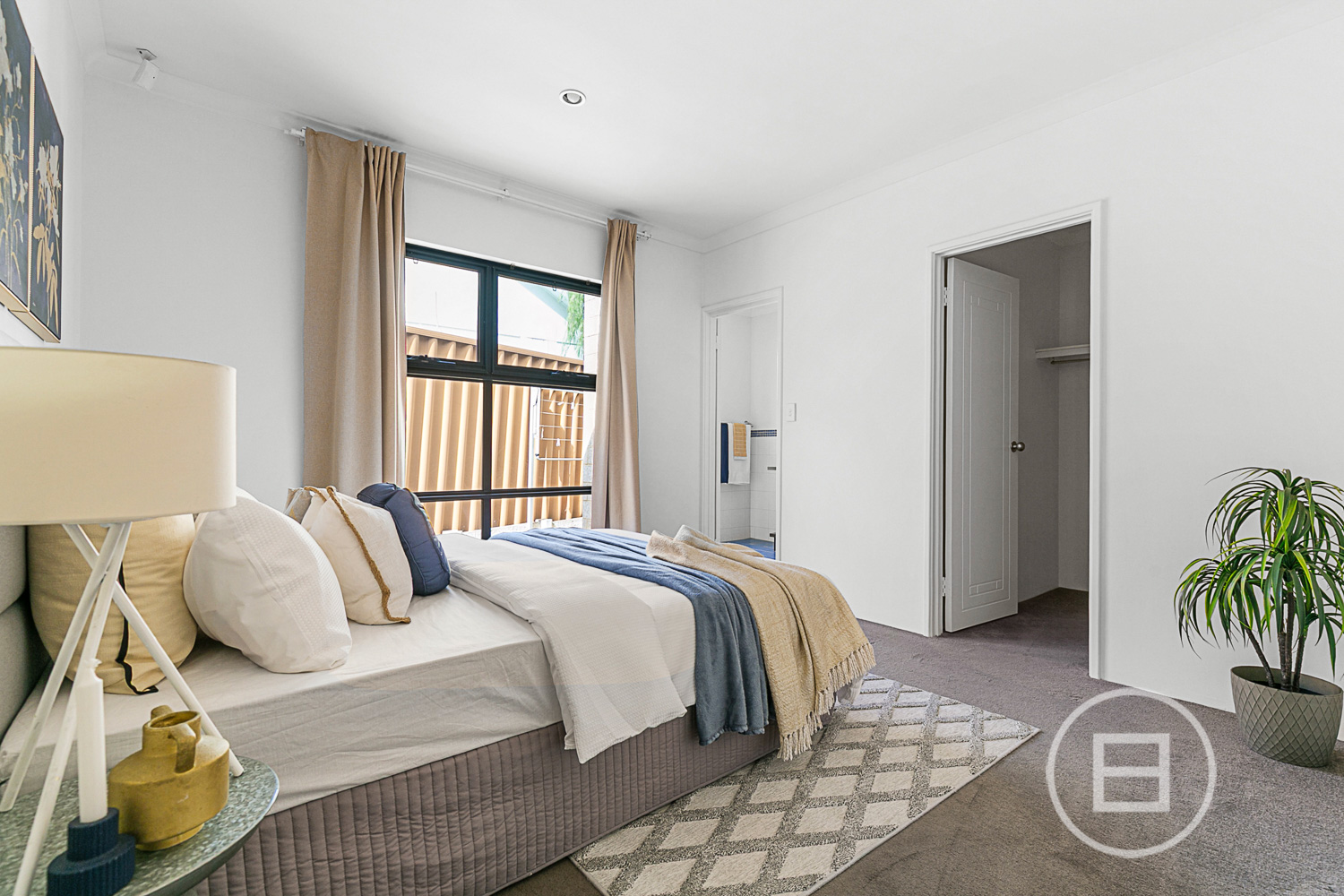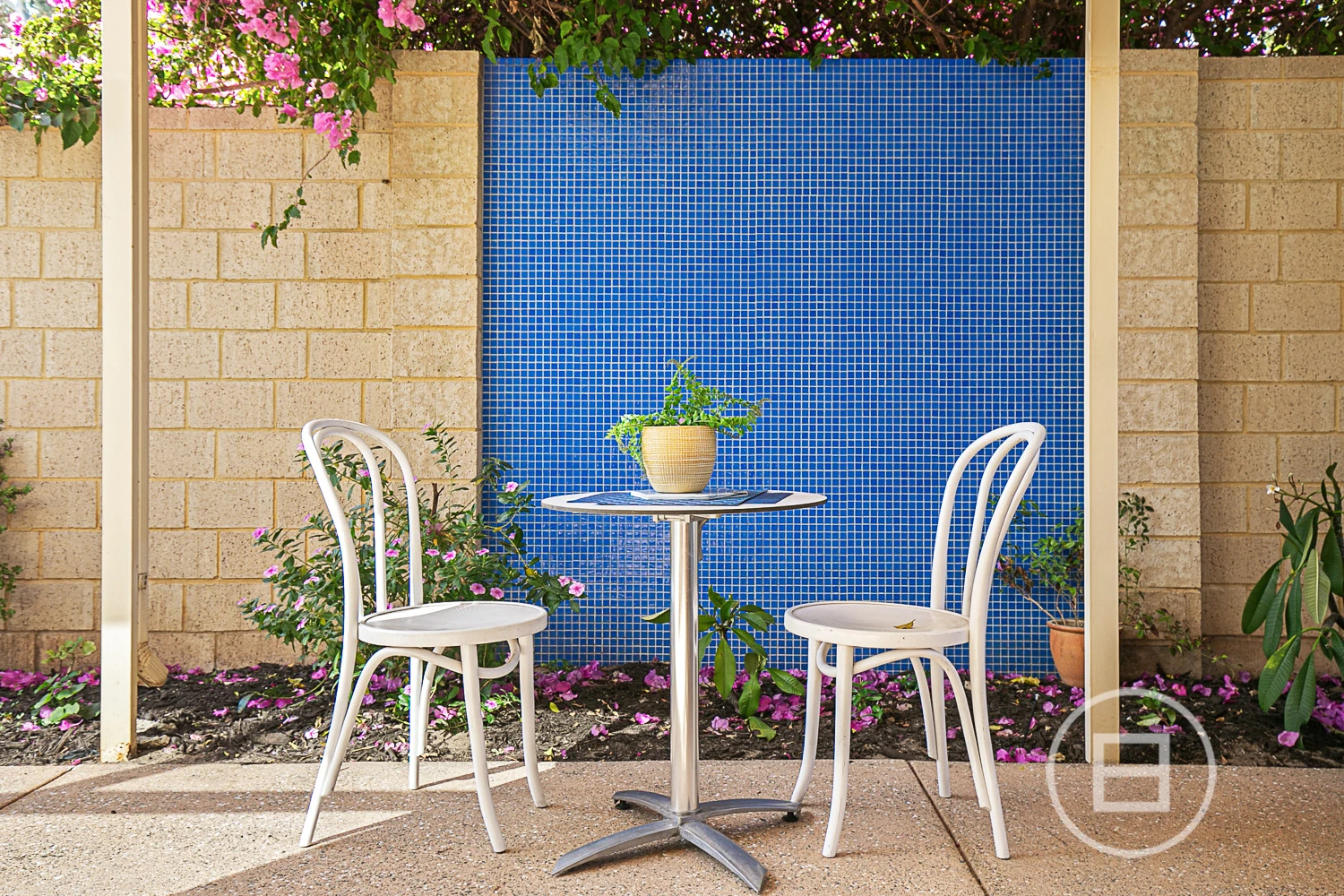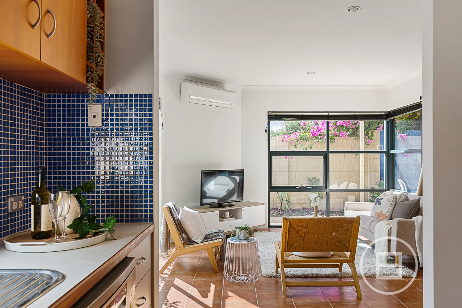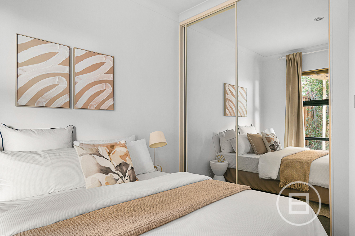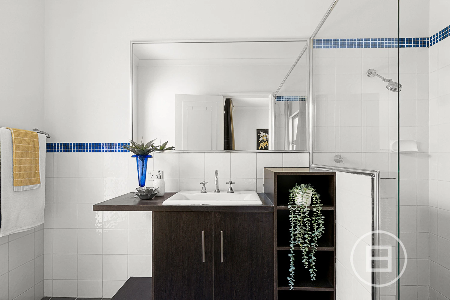 Natural light is a defining feature, streaming in through expansive floor-to-ceiling windows found in the spacious open-plan living and dining zone. The home has been freshly repainted making the residence feel like your own blank canvas. High ceilings and a sophisticated neutral palette lend a sense of airiness and relaxed elegance to every room. The heart of the home is a contemporary kitchen where a bold blue mosaic tiled splashback adds vibrancy against attractive cabinetry, premium appliances, and overhead and under-bench storage.