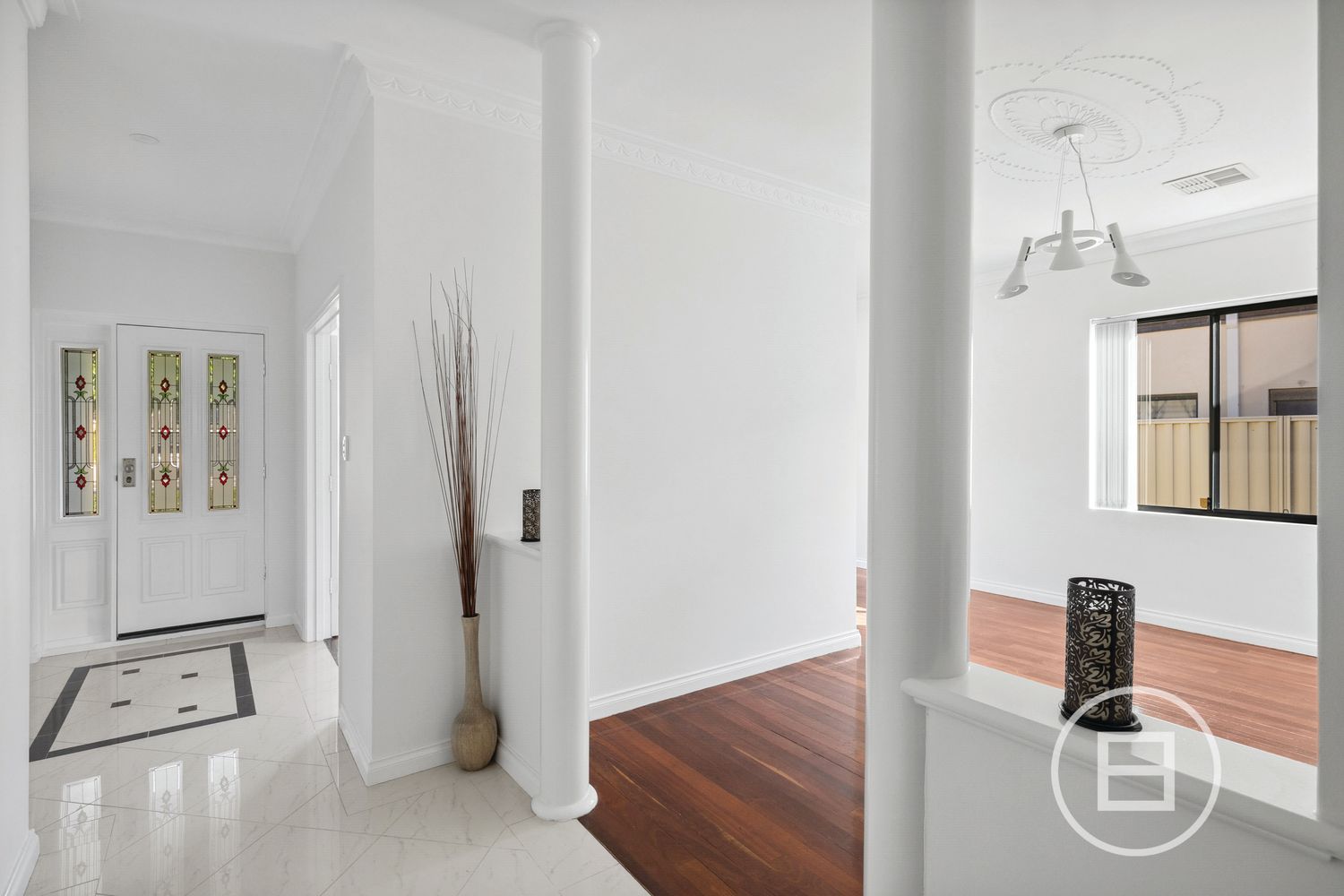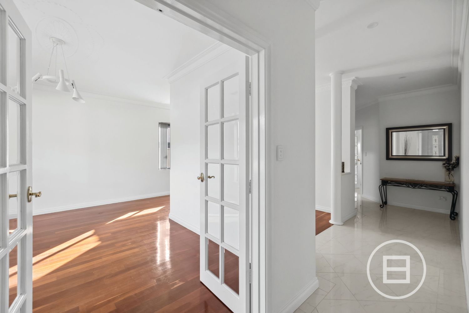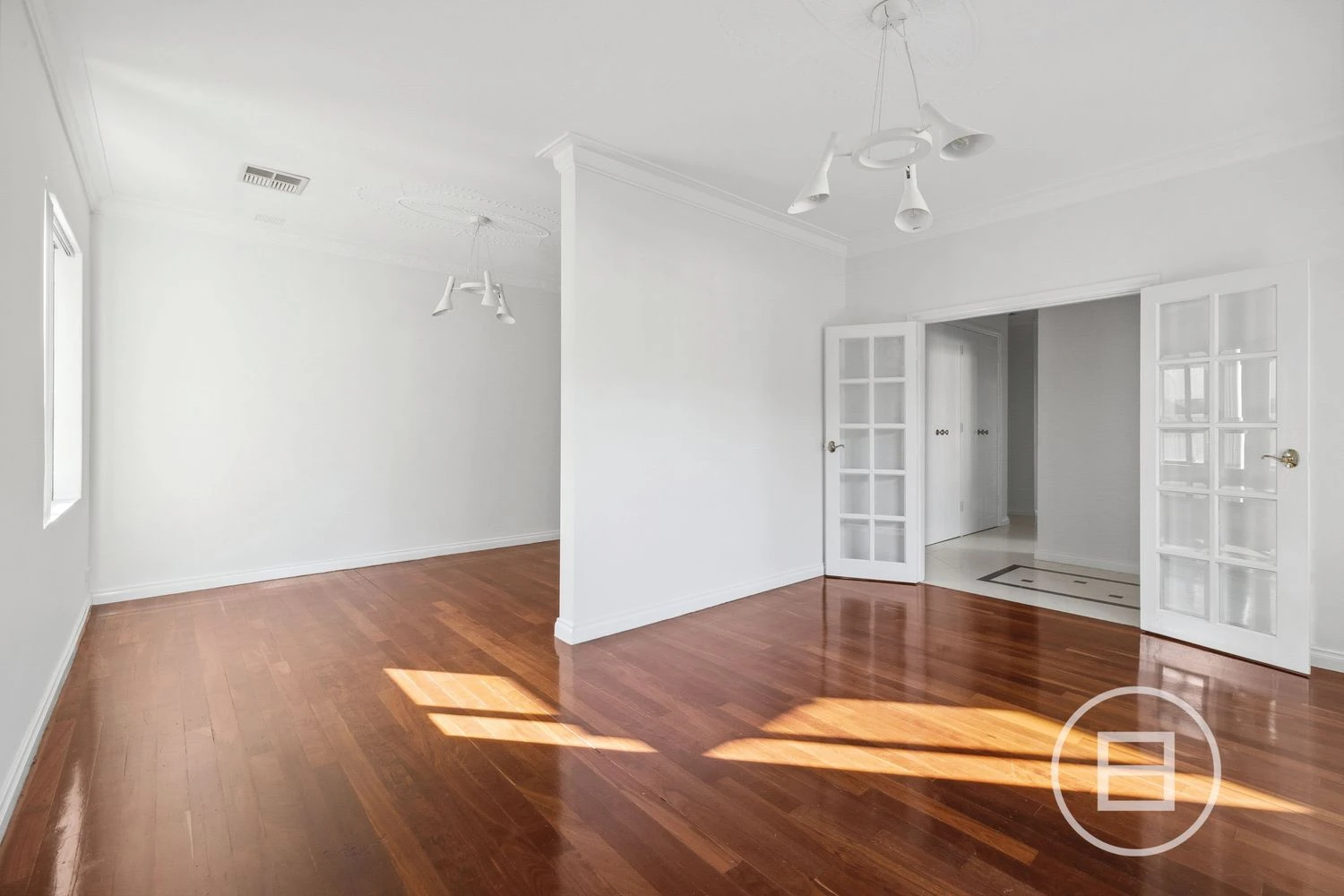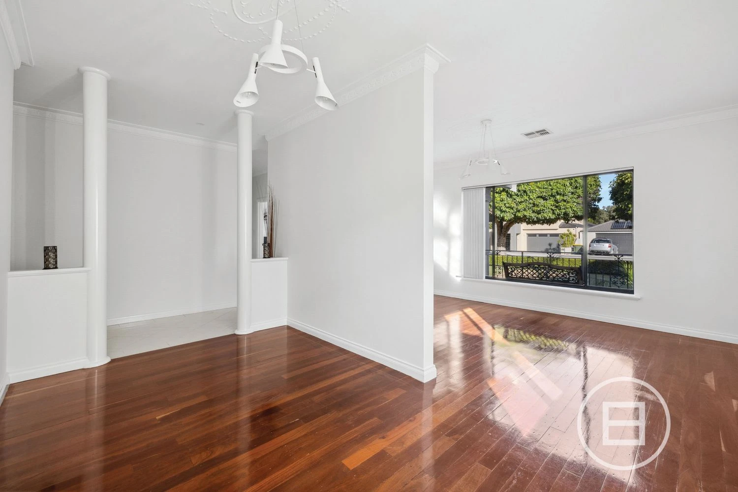 Step inside to discover large windows that flood the home with excellent natural light, complemented by elegant decorative ceiling cornices, mouldings, and modern pendant lighting throughout. The formal dining room at the front of the residence flows alongside a separate living area with impressive timber flooring creating a versatile space for everyday living and entertaining.