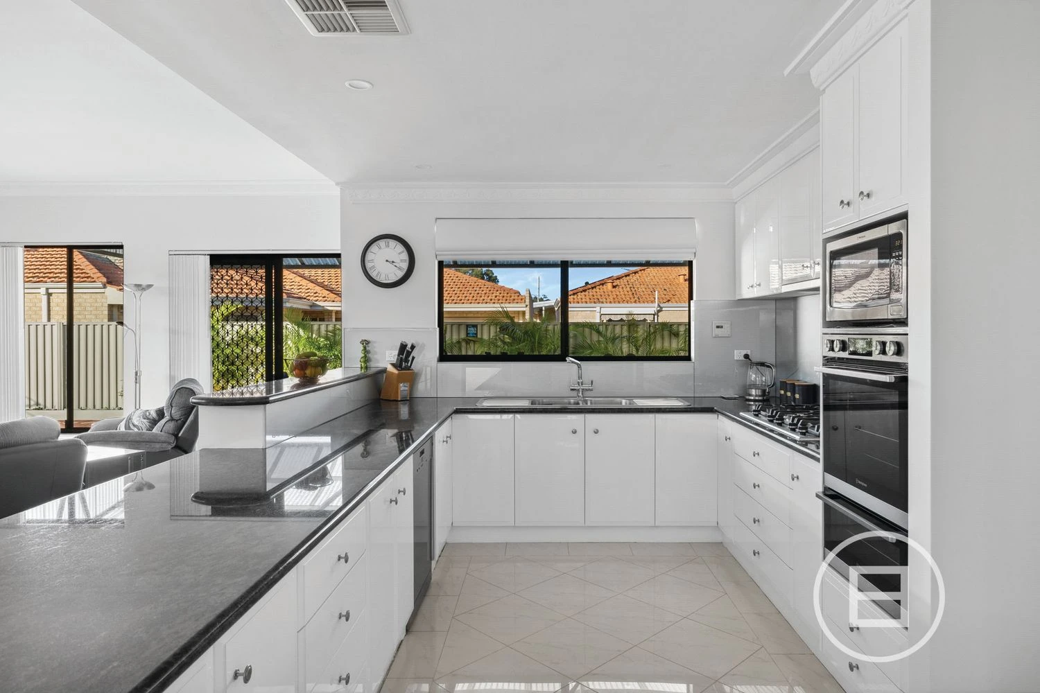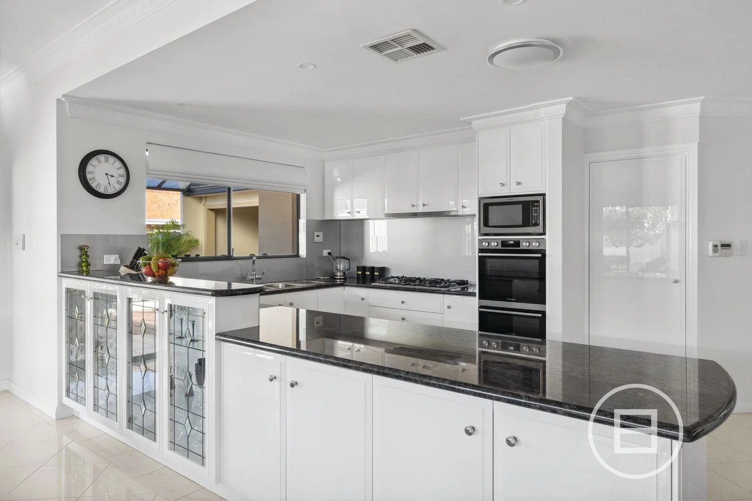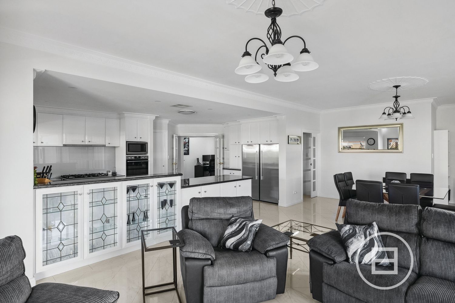 The kitchen is a chef’s delight with sleek black stone benchtops, ample white cabinetry featuring exquisite glass display cabinets. Equipped with a new gas cooktop, new built-in double oven, new sink and tapware, plus a spacious breakfast bar, this kitchen is perfectly suited for family meals or social gatherings. The kitchen opens up to a large living area which is the heart of the home. This area boasts endless space for entertaining and relaxing with family and friends.