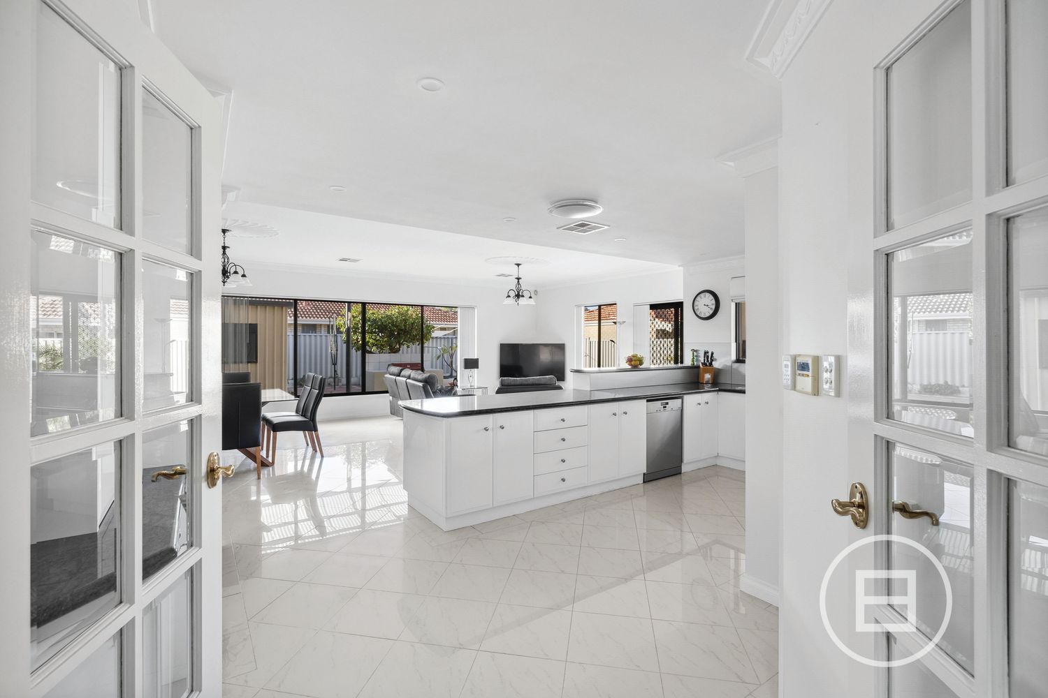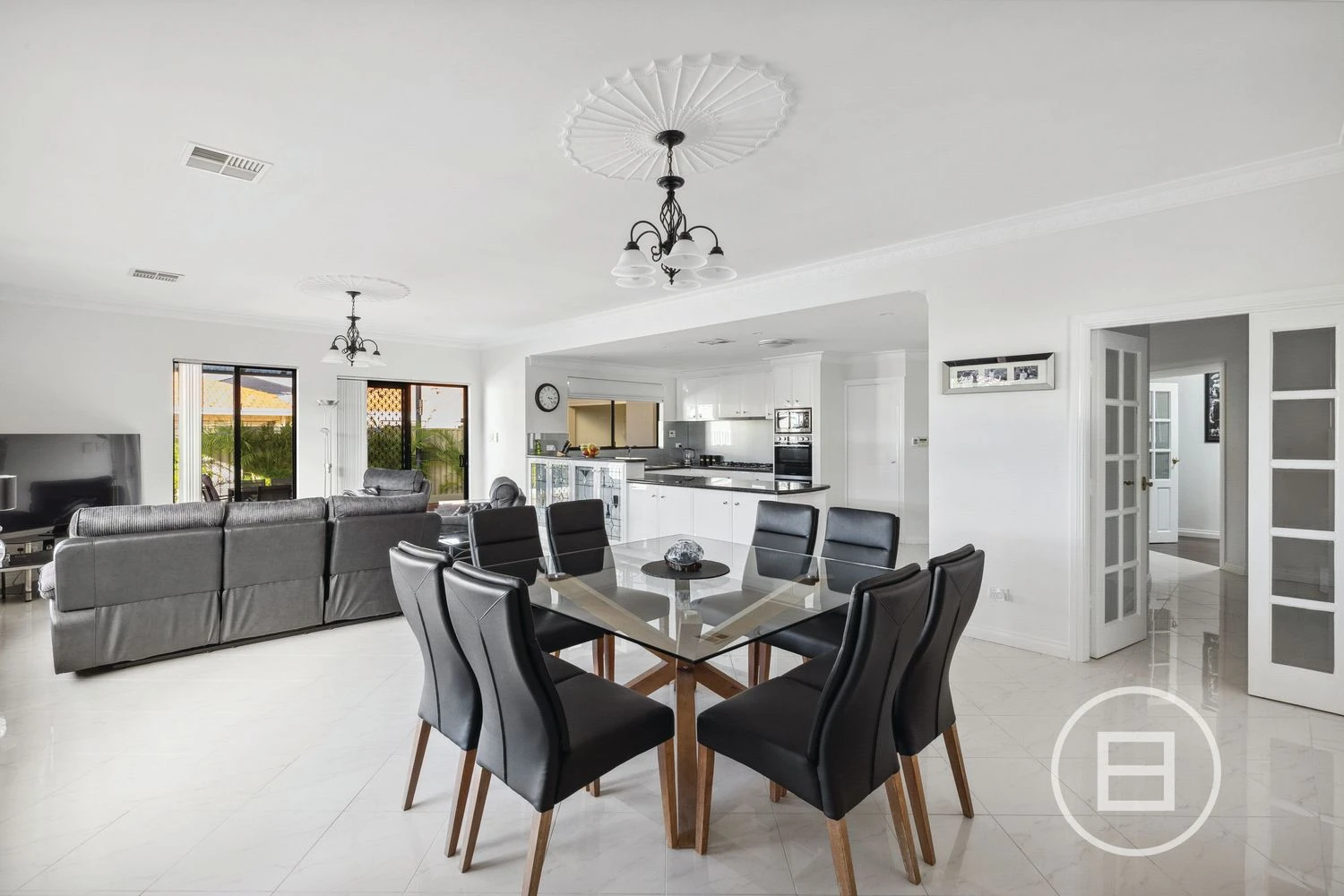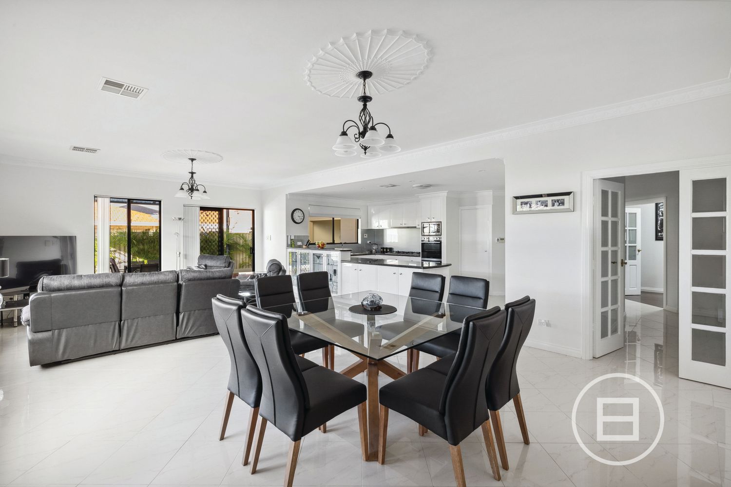 The kitchen is a chef’s delight with sleek black stone benchtops, ample white cabinetry featuring exquisite glass display cabinets. Equipped with a new gas cooktop, new built-in double oven, new sink and tapware, plus a spacious breakfast bar, this kitchen is perfectly suited for family meals or social gatherings. The kitchen opens up to a large living area which is the heart of the home. This area boasts endless space for entertaining and relaxing with family and friends.