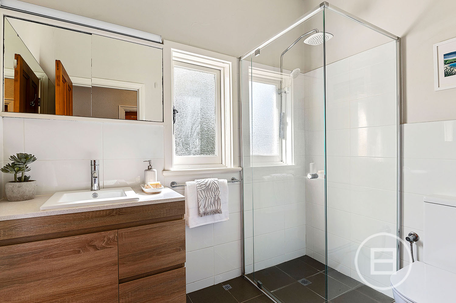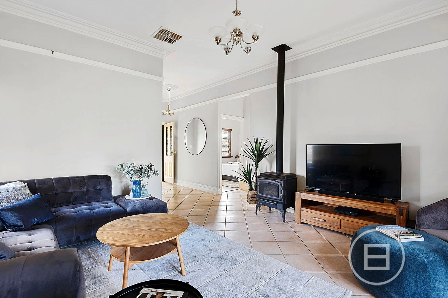 Sustainability is key here. The home features a Fronius inverter with 23 solar panels, a Rinnai Infinity hot water system, and a solar-electric boosted hot water system. Cooling options include evaporative air conditioning on the lower level, ceiling fans throughout, and reverse-cycle air conditioning in the master bedroom.