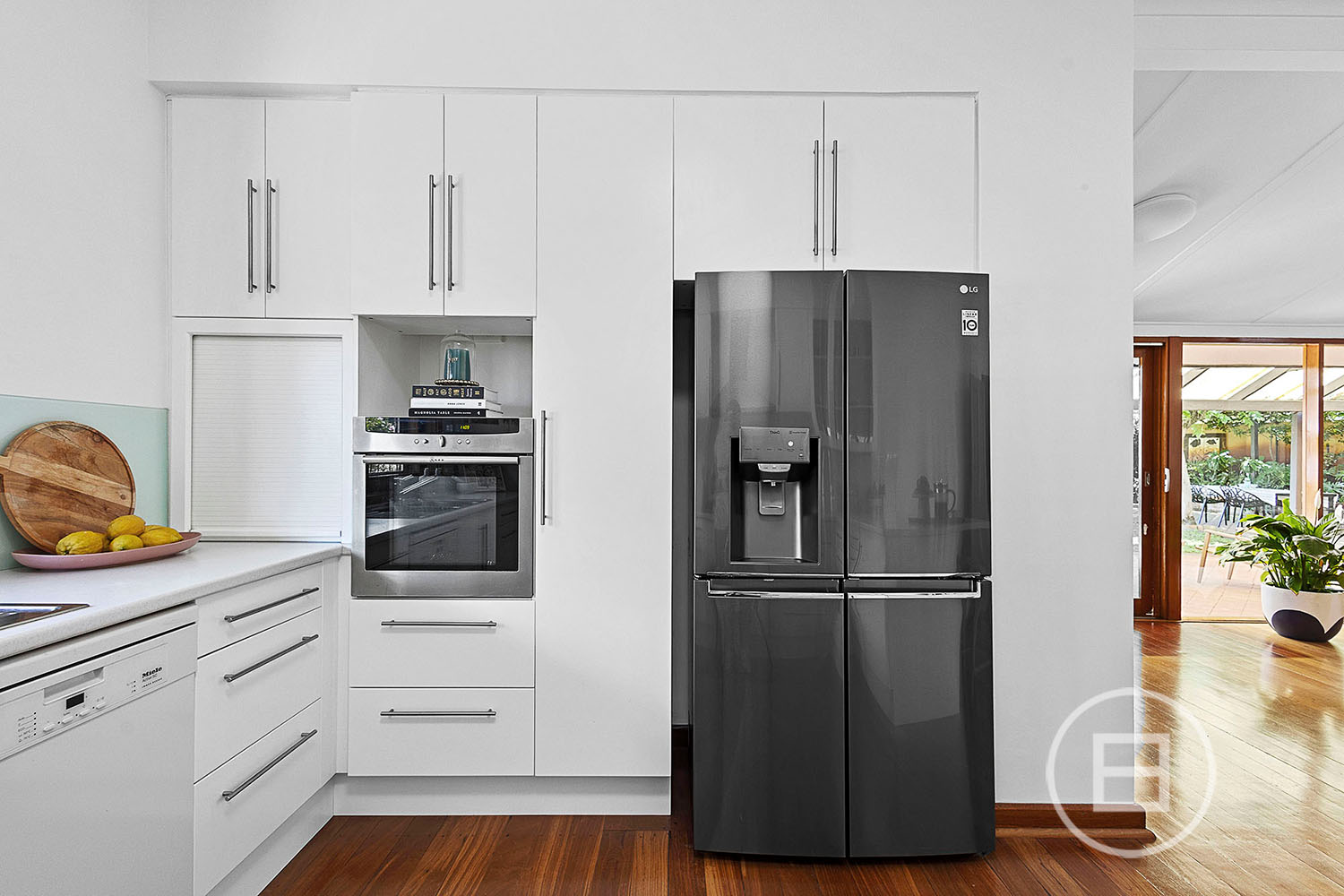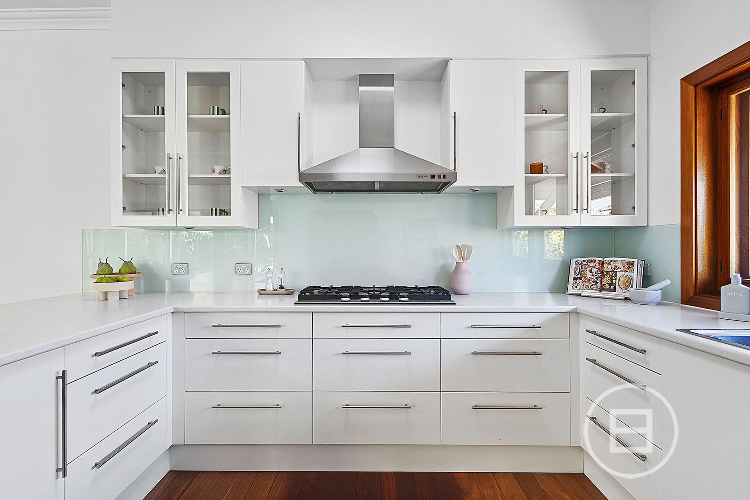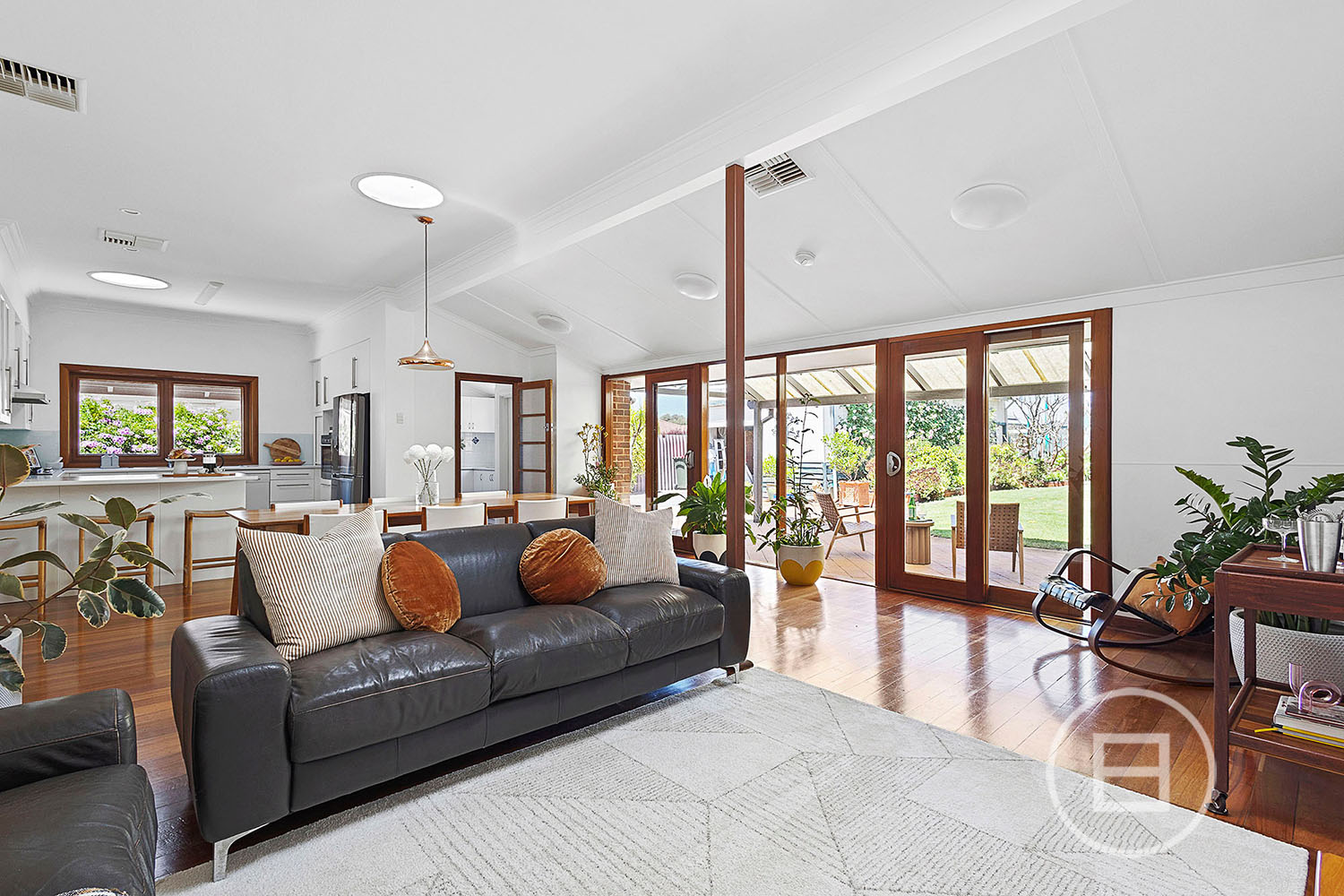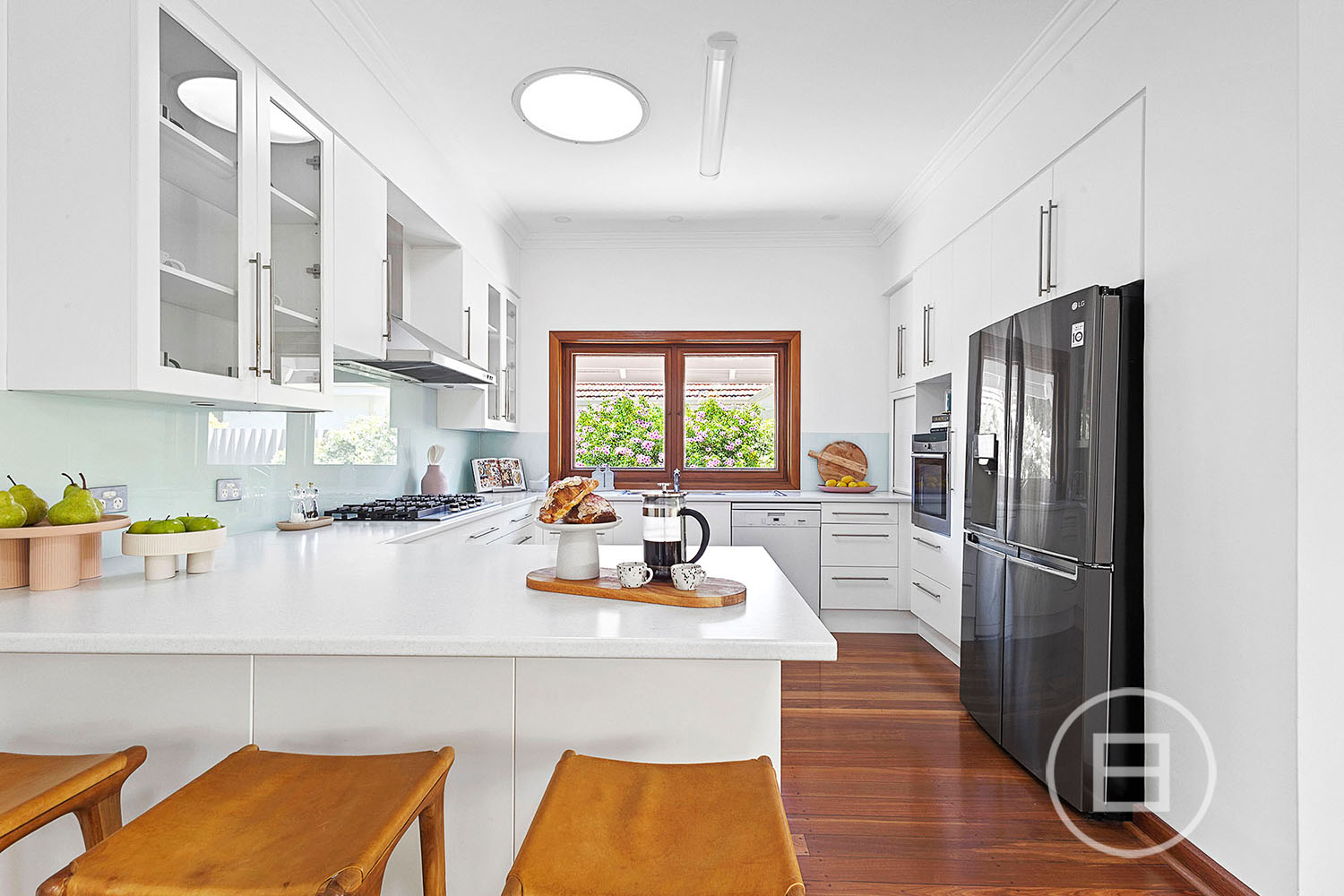 Inside, the open-plan living and dining area features polished timber floors and large windows overlooking the gardens. The updated kitchen includes laminate benchtops, white cabinetry, glass display cupboards, a NEFF oven, and a stainless-steel rangehood - designed for both style and practicality.