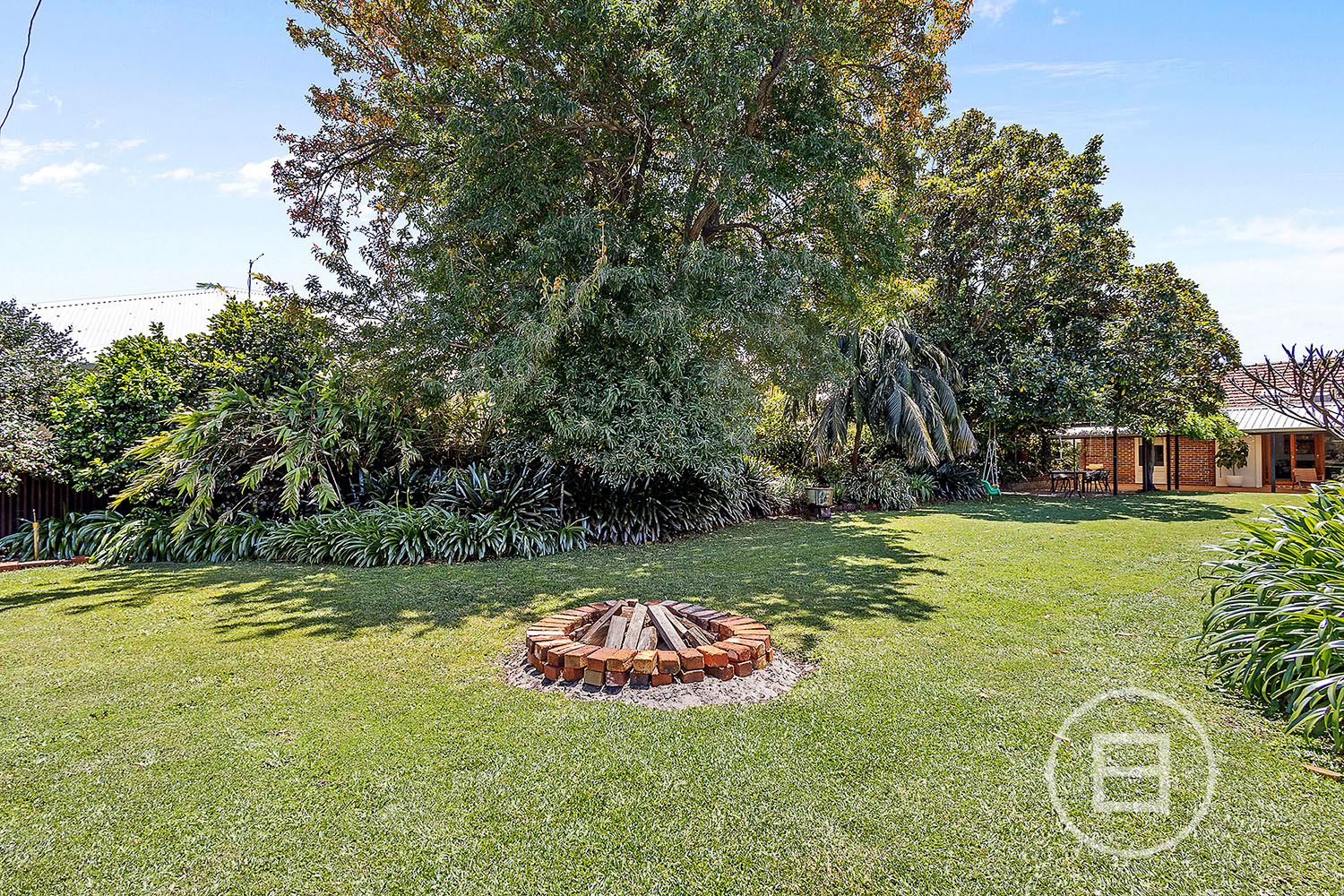 Entertaining and outdoor living are a clear focus. The large undercover patio connects to expansive manicured lawns and landscaped gardens, all beautifully framed by established fruit trees, ideal for gatherings or quiet relaxation. A shaded pergola and brick firepit offer additional spaces to unwind, while the in-ground swimming pool provides a central feature during summer.